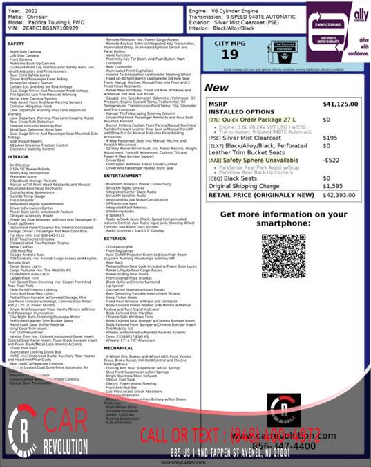 Check out this pre-owned 2022 Chrysler Pacifica we recently got in. The Chrysler Pacifica Touring L's pristine good looks were combined with the Chrysler high standard of excellence in order to make this a unique find. You've found the one you've been looking for. Your dream car. You can finally stop searching... You've found the one you've been looking for. This is the one. Just what you've been looking for. Car Revolution has been in business since 1998 with 2 locations and over 300 cars. A family owned business, focused and determined to extend hospitality to all our clients. We make every effort to present information that is accurate. However, it is based on data provided by the vehicle manufacturer and other sources. Therefore exact Configuration, Color, Certification and Accessories should be used as a guide only and are not guaranteed under any circumstances, for any inaccuracies, claims of losses of any nature. All advertised prices includes all cost to be paid by the consumer, except: Title, Taxes, Registration, License Fees, Insurance, Dealer Prep, Additional Options and include all applicable rebates. Subject to Credit Approval. Every effort is made in order to display accurate and current vehicle information, including Pricing. All vehicles are subjected to prior sale, removal and transport elsewhere, awaiting Title and Ownership Confirmation. Inventory is updated daily and subject to change. Not responsible for typographical errors or omissions. To better insure the specific vehicle's availability, call us right away at 732-527-0477 and feel free to ask any questions. EMG-WB