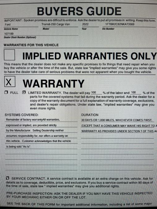 Thank you for your interest in one of Car Revolution's online offerings. Please continue for more information regarding this 2022 Ford Transit-250 Cargo Van MED ROOF AWD with 86,331mi. This Ford includes: Optional Equipment: Safety and Security Daytime running lights Back-up alarm Turn signal indicator in door mirrors High Resolution Digital Camera rear mounted camera Reverse Sensing System rear parking sensors Safety BACK UP ALARM Back-up alarm Convenience Heated driver and passenger side door mirrors Driver visor mirror Illuminated driver visor mirror Passenger visor mirror Illuminated passenger visor mirror Cruise Control w/Adjustable Speed Limiting Device (ASLD) cruise control with steering wheel mounted controls Fixed second-row windows Rear window defroster Fixed rear windshield Day/Night rearview mirror Comfort Manual driver seat lumbar Cloth front seat upholstery Cloth front seatback upholstery Automatic climate control Front passenger seat armrest Driver seat manual reclining, lumbar support and fore/aft control Exterior and Appearance Non-metallic paint Seating Cloth Front Bucket Seats Bucket front seats Cloth front seat upholstery Cloth front seatback upholstery 2WAY DRV/PASS PALAZZO CLOTH Bucket front seats Manual driver seat lumbar Driver seat armrest Front passenger seat armrest Driver seat manual reclining, lumbar support and fore/aft control Passenger seat manual reclining and fore/aft control Exterior SHORT-ARM PWR HEAT MIRRORS Power door mirrors Heated driver and passenger side door mirrors Standard style side mirrors Manual folding door mirrors Turn signal indicator in door mirrors FIXED REAR AND PASS DOOR GLASS Fixed second-row windows Rear window defroster Fixed rear windshield Day/Night rearview mirror FRONT LICENSE PLATE BRACKET Front license plate bracket DAYTIME RUNNING LAMPS Daytime running lights Rear-Window Defroster Rear window defroster In-car Entertainment SYNC 4 external memory control SYNC 4 with Enhanced Voice Recognition voice activated audio controls 12 inch primary display Primary monitor touchscreen Additional Options Order Code 101A SHIP-THRU AUTO TRUCK Interior CRUISE CONTROL Cruise Control w/Adjustable Speed Limiting Device (ASLD) cruise control with steering wheel mounted controls ILLUMINATED SUN VISORS Driver visor mirror Illuminated driver visor mirror Passenger visor mirror Illuminated passenger visor mirror HIGH RES REAR VIEW CAMERA High Resolution Digital Camera rear mounted camera ACC with ASLD cruise control with stop and go REVERSE SENSING SYSTEM Reverse Sensing System rear parking sensors DARK PALAZZO GRAY CLOTH Rearview Mirror Day/Night rearview mirror Engine START/STOP SWITCH DELETE Entertainment SYNC 4 AM/FM BLUETOOTH Automatic climate control Air conditioning - Yes SYNC 4 external memory control SYNC 4 with Enhanced Voice Recognition voice activated audio controls 1 total number of 1st row displays 12 inch primary display Primary monitor touchscreen Connected Navigation integrated navigation system with voice activation 911 Assist emergency SOS system via mobile device SYNC 4 AppLink/Apple CarPlay/Android Auto smart device app link 2 USB ports AM/FM Power door mirrors Heated driver and passenger side door mirrors Standard style side mirrors Power folding door mirrors Ford Co-Pilot360 - BLIS with Trailer Tow Coverage active blind spot system Cross-Traffic Alert collision warning Turn signal indicator in door mirrors Paint OXFORD WHITE Non-metallic paint Technology and Telematics Connected Navigation integrated navigation system with voice activation 911 Assist emergency SOS system via mobile device SYNC 4 AppLink/Apple CarPlay/Android Auto smart device app link *Note - For third party subscriptions or services, please contact the dealer for more information.* Sophistication & understated luxury comes standard on this Ford Transit-250 Cargo Van MED ROOF AWD. Well-known by many, the Transit-250 Cargo Van has become a household name in the realm of quality and prestige. No matter the varying terrain or weather conditions, this all-wheel drive vehicle will help you reach your destination safely and securely in a well-appointed cabin with many features found on cars twice the price. This is about the time when you're saying it is too good to be true, and let us be the one's to tell you, it is absolutely true. Car Revolution has been in business since 1998 with 2 locations and over 300 cars. A family owned business, focused and determined to extend hospitality to all our clients. We make every effort to present information that is accurate. However, it is based on data provided by the vehicle manufacturer and other sources. Therefore exact Configuration, Color, Certification and Accessories should be used as a guide only and are not guaranteed under any circumstances, for any inaccuracies, claims of losses of any nature. All advertised prices includes all cost to be paid by the consumer, except: Title, Taxes, Registration, License Fees, Insurance, Dealer Prep, Additional Options and include all applicable rebates. Subject to Credit Approval. Every effort is made in order to display accurate and current vehicle information, including Pricing. All vehicles are subjected to prior sale, removal and transport elsewhere, awaiting Title and Ownership Confirmation. Inventory is updated daily and subject to change. Not responsible for typographical errors or omissions. To better insure the specific vehicle's availability, call us right away at 856-316-3444 and feel free to ask any questions. EMG-WB Check out this pre-owned 2022 Ford Transit Cargo Van we recently got in. With amenities and luxuries befitting a modern day king, this splendorous coach reigns supreme. Savor the satisfaction of safety in any condition with this AWD Ford Transit Cargo Van. Superior acceleration, unmatched traction and stability as well as a luxurious interior round out the impressive features of this AWD Ford Transit Cargo Van. The Ford Transit Cargo Van will provide you 