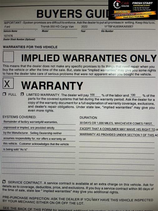 Contact Car Revolution today for information on dozens of vehicles like this 2022 Ford Transit-350 HD Cargo Van HIGH ROOF EXT AWD. This Ford includes: Optional Equipment: Safety and Security Back-up alarm Reverse Sensing System rear parking sensors Safety BACK UP ALARM Back-up alarm Convenience Vinyl/rubber cargo area floor Cargo area tie downs Cruise Control w/Adjustable Speed Limiting Device (ASLD) cruise control with steering wheel mounted controls Rear window defroster Fixed rear windshield Day/Night rearview mirror Comfort Full vinyl floor covering Full floor coverage Exterior and Appearance Non-metallic paint Exterior FIXED REAR CARGO DOOR GLASS Rear window defroster Fixed rear windshield Day/Night rearview mirror FRONT LICENSE PLATE BRACKET Front license plate bracket Rear-Window Defroster Rear window defroster Additional Options Order Code 101A Interior CRUISE CONTROL Cruise Control w/Adjustable Speed Limiting Device (ASLD) cruise control with steering wheel mounted controls TIE DOWN CARGO HOOKS Cargo area tie downs VINYL F/R FLOOR COVERING Full vinyl floor covering Vinyl/rubber cargo area floor Full floor coverage 2 ADDITIONAL KEYS REVERSE SENSING SYSTEM Reverse Sensing System rear parking sensors DARK PALAZZO GRAY VINYL Rearview Mirror Day/Night rearview mirror Engine START/STOP SWITCH DELETE SPEED LIMIT DEVICE (75 MPH) Paint OXFORD WHITE Non-metallic paint *Note - For third party subscriptions or services, please contact the dealer for more information.* Indulge yourself with one of the most highly crafted, most luxurious automobiles available today. Take home this 2022 Ford Transit-350 HD Cargo Van HIGH ROOF EXT AWD and enjoy the safety and added performance of AWD. This 2022 Ford Transit-350 HD Cargo Van has such low mileage it has been parked more than driven. Car Revolution has been in business since 1998 with 2 locations and over 300 cars. A family owned business, focused and determined to extend hospitality to all our clients. We make every effort to present information that is accurate. However, it is based on data provided by the vehicle manufacturer and other sources. Therefore exact Configuration, Color, Certification and Accessories should be used as a guide only and are not guaranteed under any circumstances, for any inaccuracies, claims of losses of any nature. All advertised prices includes all cost to be paid by the consumer, except: Title, Taxes, Registration, License Fees, Insurance, Dealer Prep, Additional Options and include all applicable rebates. Subject to Credit Approval. Every effort is made in order to display accurate and current vehicle information, including Pricing. All vehicles are subjected to prior sale, removal and transport elsewhere, awaiting Title and Ownership Confirmation. Inventory is updated daily and subject to change. Not responsible for typographical errors or omissions. To better insure the specific vehicle's availability, call us right away at 856-316-3444 and feel free to ask any questions. EMG-WB Car Revolution has a wide selection of exceptional pre-owned vehicles to choose from, including this 2022 Ford Transit Cargo Van. For those who are ready to drive something more than just a car, this Ford Transit Cargo Van will appeal to their idea of luxury and refinement. This Ford Transit Cargo Van is equipped with AWD for improved handling. Whether you're faced with inclement weather or just out enjoying the twisting back road, you'll have the grip of AWD on your side. Exceptional in every sense of the word, this incredibly low mileage vehicle is one of a kind. The look is unmistakably Ford, the smooth contours and cutting-edge technology of this Ford Transit Cargo Van will definitely turn heads. Car Revolution has been in business since 1998 with 2 locations and over 300 cars. A family owned business, focused and determined to extend hospitality to all our clients. We make every effort to present information that is accurate. However, it is based on data provided by the vehicle manufacturer and other sources. Therefore exact Configuration, Color, Certification and Accessories should be used as a guide only and are not guaranteed under any circumstances, for any inaccuracies, claims of losses of any nature. All advertised prices includes all cost to be paid by the consumer, except: Title, Taxes, Registration, License Fees, Insurance, Dealer Prep, Additional Options and include all applicable rebates. Subject to Credit Approval. Every effort is made in order to display accurate and current vehicle information, including Pricing. All vehicles are subjected to prior sale, removal and transport elsewhere, awaiting Title and Ownership Confirmation. Inventory is updated daily and subject to change. Not responsible for typographical errors or omissions. To better insure the specific vehicle's availability, call us right away at 856-316-3444 and feel free to ask any questions. EMG-WB