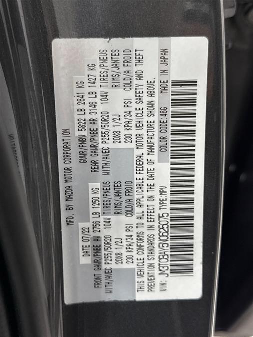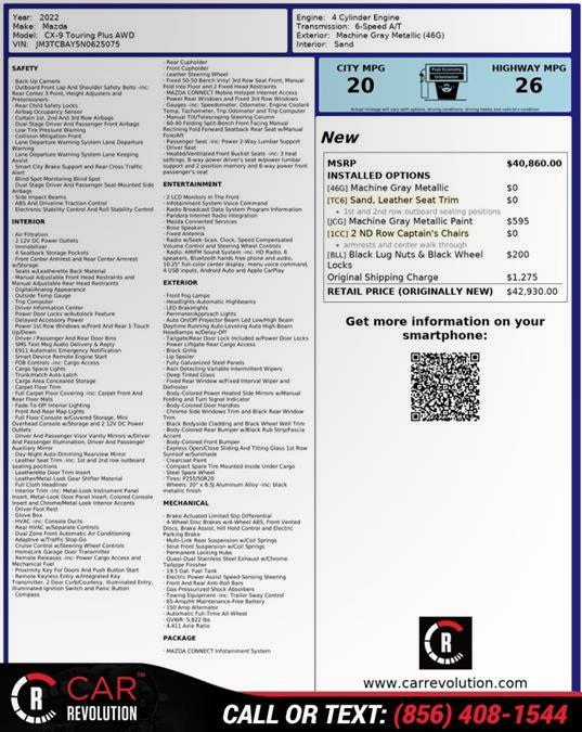 This 2022 Mazda CX-9 Touring Plus AWD is offered to you for sale by Car Revolution. This Mazda includes: Optional Equipment: Interior Sand Comfort Seating capacity - 6 Second-row captains' chairs 2 rear seat head restraints Second-row seat mounted armrests Exterior and Appearance Metallic paint Wheel security locks Seating 2nd-Row Captain's Chairs Seating capacity - 6 Second-row captains' chairs 2 rear seat head restraints Second-row seat mounted armrests Paint Machine Gray Metallic Paint Machine Gray Metallic Metallic paint Tires & Wheels Black Lug Nuts and Black Wheel Locks Wheel security locks *Note - For third party subscriptions or services, please contact the dealer for more information.* Want more room? Want more style? This Mazda CX-9 Touring Plus AWD is the vehicle for you. Is it possible to fall in love with a vehicle? It is when your vehicle is as prestige as the Mazda CX-9. No matter the varying terrain or weather conditions, this all-wheel drive vehicle will help you reach your destination safely and securely in a well-appointed cabin with many features found on cars twice the price. Added comfort with contemporary style is the leather interior to heighten the quality and craftsmanship for the Mazda CX-9 Touring Plus AWD. Car Revolution has been in business since 1998 with 2 locations and over 300 cars. A family owned business, focused and determined to extend hospitality to all our clients. We make every effort to present information that is accurate. However, it is based on data provided by the vehicle manufacturer and other sources. Therefore exact Configuration, Color, Certification and Accessories should be used as a guide only and are not guaranteed under any circumstances, for any inaccuracies, claims of losses of any nature. All advertised prices includes all cost to be paid by the consumer, except: Title, Taxes, Registration, License Fees, Insurance, Dealer Prep, Additional Options and include all applicable rebates. Subject to Credit Approval. Every effort is made in order to display accurate and current vehicle information, including Pricing. All vehicles are subjected to prior sale, removal and transport elsewhere, awaiting Title and Ownership Confirmation. Inventory is updated daily and subject to change. Not responsible for typographical errors or omissions. To better insure the specific vehicle's availability, call us right away at 856-316-3444 and feel free to ask any questions. EMG-WB Car Revolution is pleased to be currently offering this 2022 Mazda CX-9 Touring Plus with 57,022mi. This SUV is a superb example of what a tough, work focused vehicle should be. Exceptional towing, acceleration and torque will help you get the job done. There's a level of quality and refinement in this Mazda CX-9 Touring Plus that you won't find in your average vehicle. Enjoy driving? Well now you will get more thrills behind the wheel thanks to the heightened performance of AWD. Better handling. Better traction. Better driving experience. Added comfort with contemporary style is the leather interior to heighten the quality and craftsmanship for the Mazda CX-9 Touring Plus. Car Revolution has been in business since 1998 with 2 locations and over 300 cars. A family owned business, focused and determined to extend hospitality to all our clients. We make every effort to present information that is accurate. However, it is based on data provided by the vehicle manufacturer and other sources. Therefore exact Configuration, Color, Certification and Accessories should be used as a guide only and are not guaranteed under any circumstances, for any inaccuracies, claims of losses of any nature. All advertised prices includes all cost to be paid by the consumer, except: Title, Taxes, Registration, License Fees, Insurance, Dealer Prep, Additional Options and include all applicable rebates. Subject to Credit Approval. Every effort is made in order to display accurate and current vehicle information, including Pricing. All vehicles are subjected to prior sale, removal and transport elsewhere, awaiting Title and Ownership Confirmation. Inventory is updated daily and subject to change. Not responsible for typographical errors or omissions. To better insure the specific vehicle's availability, call us right away at 856-316-3444 and feel free to ask any questions. EMG-WB