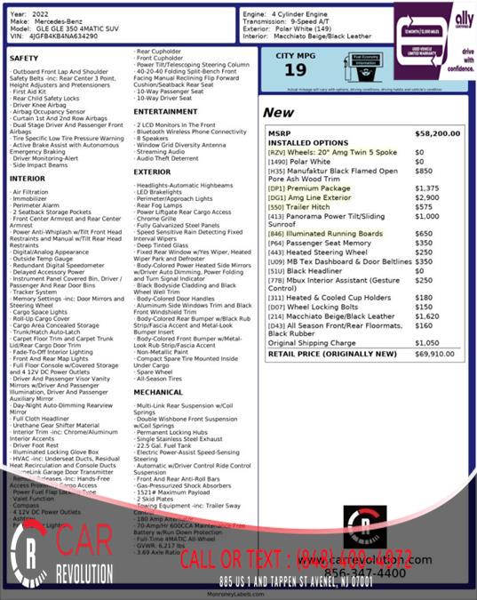 Check out this pre-owned 2022 Mercedes-Benz GLE we recently got in. Want more room? Want more style? This Mercedes-Benz GLE GLE 350 is the vehicle for you. This Mercedes-Benz GLE GLE 350 is for the discerning driver who demands the utmost of his vehicle. Enjoy the grip and control of AWD performance in this nicely equipped Mercedes-Benz GLE GLE 350. With less than 38,437mi on this Mercedes-Benz GLE, you'll appreciate the practically showroom newness of this vehicle. Car Revolution has been in business since 1998 with 2 locations and over 300 cars. A family owned business, focused and determined to extend hospitality to all our clients. We make every effort to present information that is accurate. However, it is based on data provided by the vehicle manufacturer and other sources. Therefore exact Configuration, Color, Certification and Accessories should be used as a guide only and are not guaranteed under any circumstances, for any inaccuracies, claims of losses of any nature. All advertised prices includes all cost to be paid by the consumer, except: Title, Taxes, Registration, License Fees, Insurance, Dealer Prep, Additional Options and include all applicable rebates. Subject to Credit Approval. Every effort is made in order to display accurate and current vehicle information, including Pricing. All vehicles are subjected to prior sale, removal and transport elsewhere, awaiting Title and Ownership Confirmation. Inventory is updated daily and subject to change. Not responsible for typographical errors or omissions. To better insure the specific vehicle's availability, call us right away at 732-527-0477 and feel free to ask any questions. EMG-WB