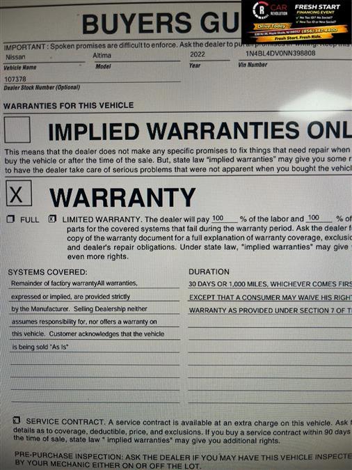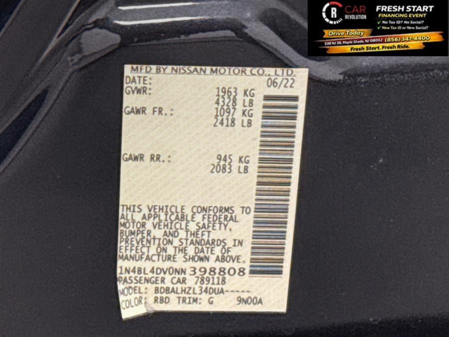 Contact Car Revolution today for information on dozens of vehicles like this 2022 Nissan Altima 2.5 SV. This Nissan includes: Optional Equipment: Interior Floor Mats/trunk Mat/hideaway Net Carpet front and rear floor mats Carpet cargo mat Cargo net Charcoal Convenience Carpet cargo mat Cargo net Comfort Carpet front and rear floor mats Exterior and Appearance Metallic paint Paint Storm Blue Metallic Metallic paint Emissions 50 State Emissions LEV3-SULEV30 emissions Tier 3 Bin 30 emissions *Note - For third party subscriptions or services, please contact the dealer for more information.* The Nissan Altima 2.5 SV speaks volumes about it's driver, uncompromising individuality, passion for driving, and standards far above the ordinary. It's exceptional fuel-efficiency is a clear sign that not all vehicles are created with the same standards. It's not often you find just the vehicle you are looking for AND with low mileage. This is your chance to take home a pre-owned and barely driven Nissan Altima. There are many vehicles on the market but if you are looking for a vehicle that will perform as good as it looks then this Nissan Altima 2.5 SV is the one! Car Revolution has been in business since 1998 with 2 locations and over 300 cars. A family owned business, focused and determined to extend hospitality to all our clients. We make every effort to present information that is accurate. However, it is based on data provided by the vehicle manufacturer and other sources. Therefore exact Configuration, Color, Certification and Accessories should be used as a guide only and are not guaranteed under any circumstances, for any inaccuracies, claims of losses of any nature. All advertised prices includes all cost to be paid by the consumer, except: Title, Taxes, Registration, License Fees, Insurance, Dealer Prep, Additional Options and include all applicable rebates. Subject to Credit Approval. Every effort is made in order to display accurate and current vehicle information, including Pricing. All vehicles are subjected to prior sale, removal and transport elsewhere, awaiting Title and Ownership Confirmation. Inventory is updated daily and subject to change. Not responsible for typographical errors or omissions. To better insure the specific vehicle's availability, call us right away at 856-316-3444 and feel free to ask any questions. EMG-WB Contact Car Revolution today for information on dozens of vehicles like this 2022 Nissan Altima 2.5 SV. The greater your fuel-efficiency, the less your carbon footprint. And with exceptional MPGs, this Nissan Altima treads ever so lightly on Mother Earth. A Nissan with as few miles as this one is a rare find. This Altima 2.5 SV was gently driven and it shows. There is no reason why you shouldn't buy this Nissan Altima 2.5 SV. It is incomparable for the price and quality. Based on the superb condition of this vehicle, along with the options and color, this Nissan Altima 2.5 SV is sure to sell fast. Car Revolution has been in business since 1998 with 2 locations and over 300 cars. A family owned business, focused and determined to extend hospitality to all our clients. We make every effort to present information that is accurate. However, it is based on data provided by the vehicle manufacturer and other sources. Therefore exact Configuration, Color, Certification and Accessories should be used as a guide only and are not guaranteed under any circumstances, for any inaccuracies, claims of losses of any nature. All advertised prices includes all cost to be paid by the consumer, except: Title, Taxes, Registration, License Fees, Insurance, Dealer Prep, Additional Options and include all applicable rebates. Subject to Credit Approval. Every effort is made in order to display accurate and current vehicle information, including Pricing. All vehicles are subjected to prior sale, removal and transport elsewhere, awaiting Title and Ownership Confirmation. Inventory is updated daily and subject to change. Not responsible for typographical errors or omissions. To better insure the specific vehicle's availability, call us right away at 856-316-3444 and feel free to ask any questions. EMG-WB