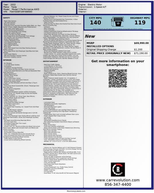 This outstanding example of a 2022 Tesla Model Y Performance is offered by Car Revolution. The Tesla Model Y is the benchmark all other SUVs strive to meet. With exceptional power, towing and handling, this SUV can handle anything thrown at it. This Tesla Model Y Performance is for the discerning driver who demands the utmost of his vehicle. Navigate through all the icky weather with ease in this AWD-equipped Tesla Model Y, and even get non-stop traction for your non-stop lifestyle! In addition to the amazing traction control, you may even qualify for an insurance reduction with this AWD vehicle. This low mileage Tesla Model Y has barely been touched. It's the next best thing to buying new. Car Revolution has been in business since 1998 with 2 locations and over 300 cars. A family owned business, focused and determined to extend hospitality to all our clients. We make every effort to present information that is accurate. However, it is based on data provided by the vehicle manufacturer and other sources. Therefore exact Configuration, Color, Certification and Accessories should be used as a guide only and are not guaranteed under any circumstances, for any inaccuracies, claims of losses of any nature. All advertised prices includes all cost to be paid by the consumer, except: Title, Taxes, Registration, License Fees, Insurance, Dealer Prep, Additional Options and include all applicable rebates. Subject to Credit Approval. Every effort is made in order to display accurate and current vehicle information, including Pricing. All vehicles are subjected to prior sale, removal and transport elsewhere, awaiting Title and Ownership Confirmation. Inventory is updated daily and subject to change. Not responsible for typographical errors or omissions. To better insure the specific vehicle's availability, call us right away at 856-316-3444 and feel free to ask any questions. EMG-WB