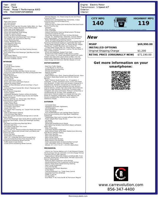 This outstanding example of a 2022 Tesla Model Y Performance is offered by Car Revolution. The Tesla Model Y is the benchmark all other SUVs strive to meet. With exceptional power, towing and handling, this SUV can handle anything thrown at it. This Tesla Model Y Performance is for the discerning driver who demands the utmost of his vehicle. Navigate through all the icky weather with ease in this AWD-equipped Tesla Model Y, and even get non-stop traction for your non-stop lifestyle! In addition to the amazing traction control, you may even qualify for an insurance reduction with this AWD vehicle. This low mileage Tesla Model Y has barely been touched. It's the next best thing to buying new. Car Revolution has been in business since 1998 with 2 locations and over 300 cars. A family owned business, focused and determined to extend hospitality to all our clients. We make every effort to present information that is accurate. However, it is based on data provided by the vehicle manufacturer and other sources. Therefore exact Configuration, Color, Certification and Accessories should be used as a guide only and are not guaranteed under any circumstances, for any inaccuracies, claims of losses of any nature. All advertised prices includes all cost to be paid by the consumer, except: Title, Taxes, Registration, License Fees, Insurance, Dealer Prep, Additional Options and include all applicable rebates. Subject to Credit Approval. Every effort is made in order to display accurate and current vehicle information, including Pricing. All vehicles are subjected to prior sale, removal and transport elsewhere, awaiting Title and Ownership Confirmation. Inventory is updated daily and subject to change. Not responsible for typographical errors or omissions. To better insure the specific vehicle's availability, call us right away at 856-316-3444 and feel free to ask any questions. EMG-WB