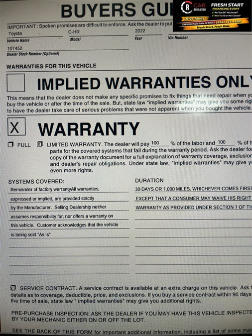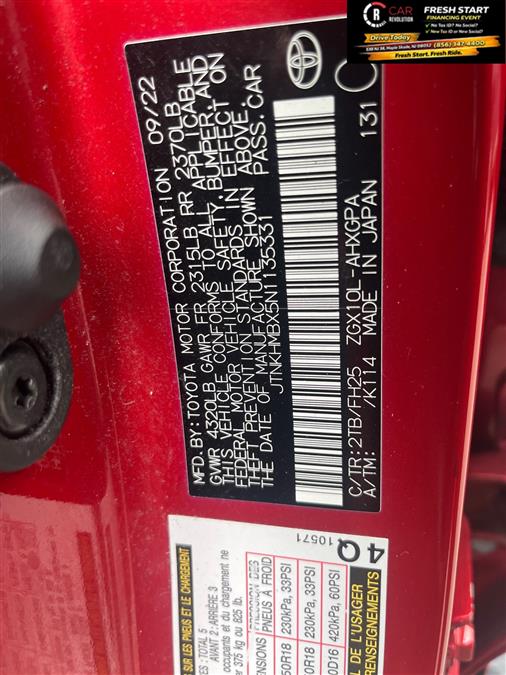 Car Revolution is honored to present a wonderful example of pure vehicle design... this 2022 Toyota C-HR Nightshade FWD only has 66,877mi on it and could potentially be the vehicle of your dreams! This Toyota includes: Optional Equipment: Interior All Weather Floor Liners/Cargo Liner Rubber front and rear floor mats Vinyl/rubber cargo mat Black Convenience Vinyl/rubber cargo mat Comfort Rubber front and rear floor mats Exterior and Appearance Metallic paint Roof accent two-tone paint scheme Paint Supersonic Red Metallic paint Emissions 50 State Emissions LEV3-ULEV125 emissions Tier 3 Bin 125 emissions Additional Options Nightshade Edition *Note - For third party subscriptions or services, please contact the dealer for more information.* Do so much more with one vehicle. This Toyota C-HR gives you everything you need an automobile to be. Stylish and fuel efficient. It's the perfect vehicle for keeping your fuel costs down and your driving enjoying up. There are many vehicles on the market but if you are looking for a vehicle that will perform as good as it looks then this Toyota C-HR Nightshade FWD is the one! Car Revolution has been in business since 1998 with 2 locations and over 300 cars. A family owned business, focused and determined to extend hospitality to all our clients. We make every effort to present information that is accurate. However, it is based on data provided by the vehicle manufacturer and other sources. Therefore exact Configuration, Color, Certification and Accessories should be used as a guide only and are not guaranteed under any circumstances, for any inaccuracies, claims of losses of any nature. All advertised prices includes all cost to be paid by the consumer, except: Title, Taxes, Registration, License Fees, Insurance, Dealer Prep, Additional Options and include all applicable rebates. Subject to Credit Approval. Every effort is made in order to display accurate and current vehicle information, including Pricing. All vehicles are subjected to prior sale, removal and transport elsewhere, awaiting Title and Ownership Confirmation. Inventory is updated daily and subject to change. Not responsible for typographical errors or omissions. To better insure the specific vehicle's availability, call us right away at 856-316-3444 and feel free to ask any questions. EMG-WB Contact Car Revolution today for information on dozens of vehicles like this 2022 Toyota C-HR Nightshade. Perfect for the on-the-go family, this Toyota C-HR Nightshade is an SUV everyone will love. With exceptional mileage, options and power, you'll insist on driving it on all your outings. The greater your fuel-efficiency, the less your carbon footprint. And with exceptional MPGs, this Toyota C-HR treads ever so lightly on Mother Earth. Just what you've been looking for. With quality in mind, this vehicle is the perfect addition to take home. The Toyota C-HR Nightshade will provide you with everything you have always wanted in a car -- Quality, Reliability, and Character. Car Revolution has been in business since 1998 with 2 locations and over 300 cars. A family owned business, focused and determined to extend hospitality to all our clients. We make every effort to present information that is accurate. However, it is based on data provided by the vehicle manufacturer and other sources. Therefore exact Configuration, Color, Certification and Accessories should be used as a guide only and are not guaranteed under any circumstances, for any inaccuracies, claims of losses of any nature. All advertised prices includes all cost to be paid by the consumer, except: Title, Taxes, Registration, License Fees, Insurance, Dealer Prep, Additional Options and include all applicable rebates. Subject to Credit Approval. Every effort is made in order to display accurate and current vehicle information, including Pricing. All vehicles are subjected to prior sale, removal and transport elsewhere, awaiting Title and Ownership Confirmation. Inventory is updated daily and subject to change. Not responsible for typographical errors or omissions. To better insure the specific vehicle's availability, call us right away at 856-316-3444 and feel free to ask any questions. EMG-WB