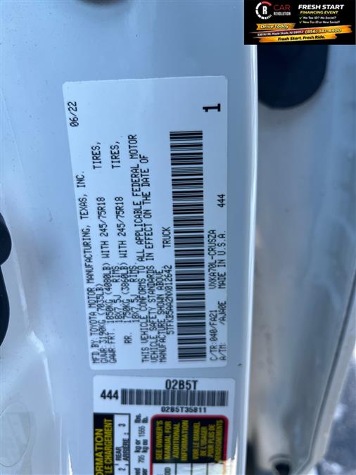 Car Revolution is excited to offer this 2022 Toyota Tundra SR. This Toyota includes: Optional Equipment: Paint White Non-metallic paint Interior Black Cold Area Package Delete Emissions 50 State Emissions LEV3-ULEV70 emissions Tier 3 Bin 70 emissions Trailering Towing Package with Hitch and 7-Pin Trailer wiring harness Class IV tow rating Trailer hitch Exterior Front Fog and Driving Lamp Delete Windshield Deicer Delete Front Spoiler Delete Exterior and Appearance Non-metallic paint Trailer wiring harness Class IV tow rating Trailer hitch Additional Options SR Tow Package - Includes Towing Hitch Receiver and 7-Pin Connector Trailer wiring harness Class IV tow rating Trailer hitch *Note - For third party subscriptions or services, please contact the dealer for more information.* You've found the one you've been looking for. Your dream car. The Toyota Tundra SR will provide you with everything you have always wanted in a car -- Quality, Reliability, and Character. There is no reason why you shouldn't buy this Toyota Tundra SR. It is incomparable for the price and quality. Car Revolution has been in business since 1998 with 2 locations and over 300 cars. A family owned business, focused and determined to extend hospitality to all our clients. We make every effort to present information that is accurate. However, it is based on data provided by the vehicle manufacturer and other sources. Therefore exact Configuration, Color, Certification and Accessories should be used as a guide only and are not guaranteed under any circumstances, for any inaccuracies, claims of losses of any nature. All advertised prices includes all cost to be paid by the consumer, except: Title, Taxes, Registration, License Fees, Insurance, Dealer Prep, Additional Options and include all applicable rebates. Subject to Credit Approval. Every effort is made in order to display accurate and current vehicle information, including Pricing. All vehicles are subjected to prior sale, removal and transport elsewhere, awaiting Title and Ownership Confirmation. Inventory is updated daily and subject to change. Not responsible for typographical errors or omissions. To better insure the specific vehicle's availability, call us right away at 856-316-3444 and feel free to ask any questions. EMG-WB 2022ToyotaTundra 2WD The Toyota Tundra 2WD SR will provide you with everything you have always wanted in a car -- Quality, Reliability, and Character. You can finally stop searching... You've found the one you've been looking for. This is the one. Just what you've been looking for. The look is unmistakably Toyota, the smooth contours and cutting-edge technology of this Toyota Tundra 2WD SR will definitely turn heads. Car Revolution has been in business since 1998 with 2 locations and over 300 cars. A family owned business, focused and determined to extend hospitality to all our clients. We make every effort to present information that is accurate. However, it is based on data provided by the vehicle manufacturer and other sources. Therefore exact Configuration, Color, Certification and Accessories should be used as a guide only and are not guaranteed under any circumstances, for any inaccuracies, claims of losses of any nature. All advertised prices includes all cost to be paid by the consumer, except: Title, Taxes, Registration, License Fees, Insurance, Dealer Prep, Additional Options and include all applicable rebates. Subject to Credit Approval. Every effort is made in order to display accurate and current vehicle information, including Pricing. All vehicles are subjected to prior sale, removal and transport elsewhere, awaiting Title and Ownership Confirmation. Inventory is updated daily and subject to change. Not responsible for typographical errors or omissions. To better insure the specific vehicle's availability, call us right away at 856-316-3444 and feel free to ask any questions. EMG-WB
