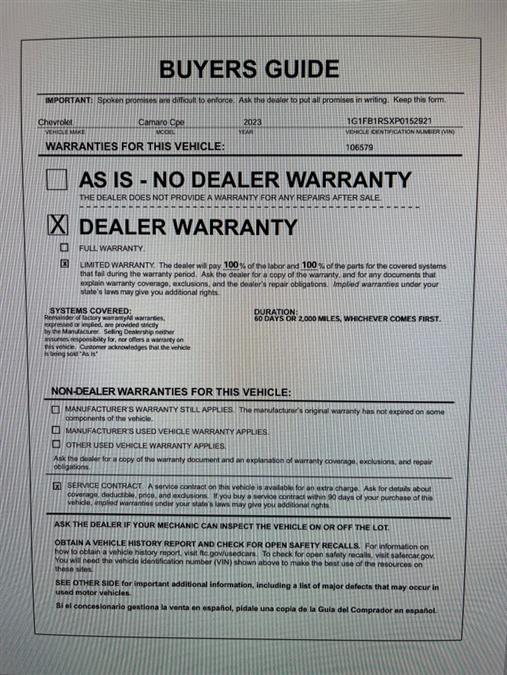 Car Revolution is pleased to be currently offering this 2023 Chevrolet Camaro Cpe 1LT with 40,392mi. This Chevrolet includes: Optional Equipment: Convenience Keyfob remote engine start Transmission 10-Speed Automatic Transmission Tremec 8-speed automatic Selectable mode transmission Transmission oil cooler Keyfob remote engine start Lock-up transmission Transmission electronic control Driver Shift Control Sequential shift with steering wheel controls Sequential shift with steering wheel controls Automatic Tremec 10-speed automatic Selectable mode transmission Transmission oil cooler Simulated carbon fiber gear shifter material Lock-up transmission Transmission electronic control Driver Shift Control Sequential shift with steering wheel controls Sequential shift with steering wheel controls Automatic Paddle-Shift Manual Controls Sequential shift with steering wheel controls Exterior and Appearance Front license plate bracket Powertrain and Mechanical Regular Unleaded Variable intake manifold Selectable mode transmission Transmission oil cooler Stainless steel dual exhaust with chrome tailpipe finisher Lock-up transmission 3.6L V-6 gasoline direct injection, DOHC, VVT variable valve control, regular unleaded, engine with cylinder deactivation and 335HP Engine Cylinders - V6 Transmission electronic control Automatic Exterior Front License Plate Bracket Front license plate bracket Additional Options Preferred Equipment Group 1LT Interior Deleted 3 Years of Remote Access Remote Vehicle Starter System Keyfob remote engine start Jet Black Engine 3.6L V6 DI Engine with VVT Regular Unleaded Variable intake manifold LEV3-ULEV50 emissions Tier 3 Bin 50 emissions Stainless steel dual exhaust with chrome tailpipe finisher 3.6L V-6 gasoline direct injection, DOHC, VVT variable valve control, regular unleaded, engine with cylinder deactivation and 335HP Engine Cylinders - V6 Tremec 10-speed automatic Selectable mode transmission Transmission oil cooler Lock-up transmission Transmission electronic control Driver Shift Control Sequential shift with steering wheel controls Sequential shift with steering wheel controls Automatic Paint Black Clearcoat paint Emissions CT/DE/ME/MD/MA/NJ/NY/OR/PA/RI/VT/WA Emissions Requirements LEV3-ULEV70 emissions Tier 3 Bin 70 emissions Suspension 2.77 Rear Axle Ratio Limited Slip Differential Delete *Note - For third party subscriptions or services, please contact the dealer for more information.* You could keep looking, but why? You've found the perfect vehicle right here. Surprising quality accompanied by a high level of performance...this Black on Jet Black Chevrolet Camaro Cpe 1LT could end up being the perfect match for you. This vehicle won't last long, take it home today. Car Revolution has been in business since 1998 with 2 locations and over 300 cars. A family owned business, focused and determined to extend hospitality to all our clients. We make every effort to present information that is accurate. However, it is based on data provided by the vehicle manufacturer and other sources. Therefore exact Configuration, Color, Certification and Accessories should be used as a guide only and are not guaranteed under any circumstances, for any inaccuracies, claims of losses of any nature. All advertised prices includes all cost to be paid by the consumer, except: Title, Taxes, Registration, License Fees, Insurance, Dealer Prep, Additional Options and include all applicable rebates. Subject to Credit Approval. Every effort is made in order to display accurate and current vehicle information, including Pricing. All vehicles are subjected to prior sale, removal and transport elsewhere, awaiting Title and Ownership Confirmation. Inventory is updated daily and subject to change. Not responsible for typographical errors or omissions. To better insure the specific vehicle's availability, call us right away at 856-316-3444 and feel free to ask any questions. EMG-WB Thank you for your interest in one of Car Revolution's online offerings. Please continue for more information regarding this 2023 Chevrolet Camaro 1LT with 40,392mi. The Chevrolet Camaro 1LT will provide you with everything you have always wanted in a car -- Quality, Reliability, and Character. Based on the superb condition of this vehicle, along with the options and color, this Chevrolet Camaro 1LT is sure to sell fast. You can finally stop searching... You've found the one you've been looking for. This is about the time when you're saying it is too good to be true, and let us be the one's to tell you, it is absolutely true.