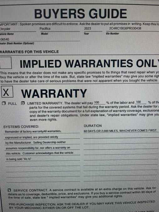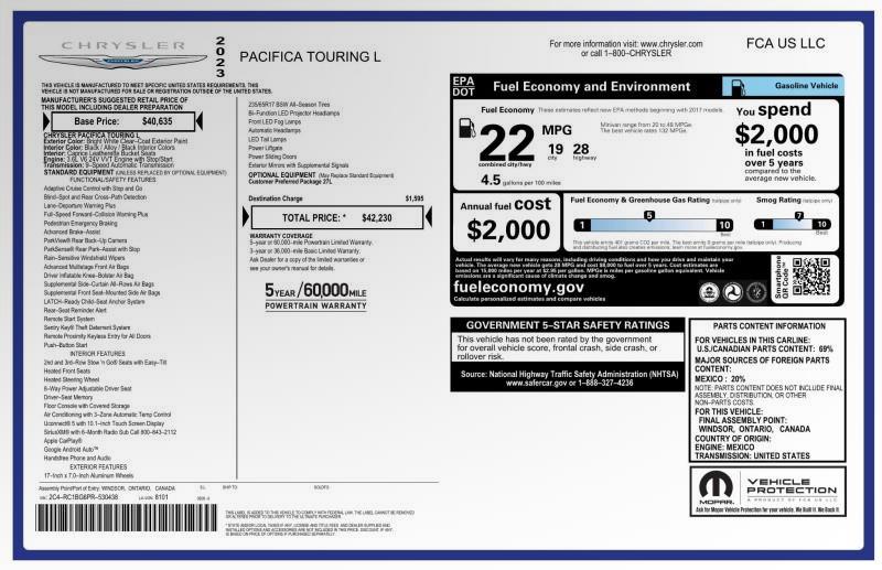 Check out this pre-owned 2023 Chrysler Pacifica we recently got in. This Chrysler includes: Optional Equipment: Additional Options Quick Order Package 27L Interior Black Seats Black/Alloy/Black Fuel Economy and Emissions Federal emissions Paint Bright White Clearcoat Clearcoat paint *Note - For third party subscriptions or services, please contact the dealer for more information.* This Chrysler Pacifica Touring L FWD is for the discerning driver who demands the utmost of his vehicle. Just what you've been looking for. With quality in mind, this vehicle is the perfect addition to take home. Beautiful color combination with Bright White Clearcoat exterior over Black/Alloy/Black interior making this the one to own! Car Revolution has been in business since 1998 with 2 locations and over 300 cars. A family owned business, focused and determined to extend hospitality to all our clients. We make every effort to present information that is accurate. However, it is based on data provided by the vehicle manufacturer and other sources. Therefore exact Configuration, Color, Certification and Accessories should be used as a guide only and are not guaranteed under any circumstances, for any inaccuracies, claims of losses of any nature. All advertised prices includes all cost to be paid by the consumer, except: Title, Taxes, Registration, License Fees, Insurance, Dealer Prep, Additional Options and include all applicable rebates. Subject to Credit Approval. Every effort is made in order to display accurate and current vehicle information, including Pricing. All vehicles are subjected to prior sale, removal and transport elsewhere, awaiting Title and Ownership Confirmation. Inventory is updated daily and subject to change. Not responsible for typographical errors or omissions. To better insure the specific vehicle's availability, call us right away at 856-316-3444 and feel free to ask any questions. EMG-WB Thank you for your interest in one of Car Revolution's online offerings. Please continue for more information regarding this 2023 Chrysler Pacifica Touring L with 60,147mi. You appreciate the finer things in life, the vehicle you drive should not be the exception. Style, performance, sophistication is in a class of its own with this stunning Chrysler Pacifica Touring L. The look is unmistakably Chrysler, the smooth contours and cutting-edge technology of this Chrysler Pacifica Touring L will definitely turn heads. A truly breathtaking example of pure vehicle design achievement...this is the vehicle of your dreams! You can finally stop searching... You've found the one you've been looking for. Car Revolution has been in business since 1998 with 2 locations and over 300 cars. A family owned business, focused and determined to extend hospitality to all our clients. We make every effort to present information that is accurate. However, it is based on data provided by the vehicle manufacturer and other sources. Therefore exact Configuration, Color, Certification and Accessories should be used as a guide only and are not guaranteed under any circumstances, for any inaccuracies, claims of losses of any nature. All advertised prices includes all cost to be paid by the consumer, except: Title, Taxes, Registration, License Fees, Insurance, Dealer Prep, Additional Options and include all applicable rebates. Subject to Credit Approval. Every effort is made in order to display accurate and current vehicle information, including Pricing. All vehicles are subjected to prior sale, removal and transport elsewhere, awaiting Title and Ownership Confirmation. Inventory is updated daily and subject to change. Not responsible for typographical errors or omissions. To better insure the specific vehicle's availability, call us right away at 856-316-3444 and feel free to ask any questions. EMG-WB