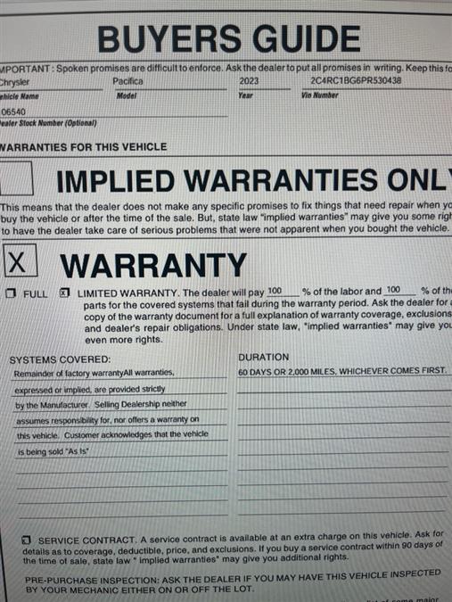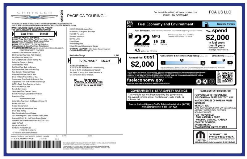 Check out this pre-owned 2023 Chrysler Pacifica we recently got in. This Chrysler includes: Optional Equipment: Additional Options Quick Order Package 27L Interior Black Seats Black/Alloy/Black Fuel Economy and Emissions Federal emissions Paint Bright White Clearcoat Clearcoat paint *Note - For third party subscriptions or services, please contact the dealer for more information.* This Chrysler Pacifica Touring L FWD is for the discerning driver who demands the utmost of his vehicle. Just what you've been looking for. With quality in mind, this vehicle is the perfect addition to take home. Beautiful color combination with Bright White Clearcoat exterior over Black/Alloy/Black interior making this the one to own! Car Revolution has been in business since 1998 with 2 locations and over 300 cars. A family owned business, focused and determined to extend hospitality to all our clients. We make every effort to present information that is accurate. However, it is based on data provided by the vehicle manufacturer and other sources. Therefore exact Configuration, Color, Certification and Accessories should be used as a guide only and are not guaranteed under any circumstances, for any inaccuracies, claims of losses of any nature. All advertised prices includes all cost to be paid by the consumer, except: Title, Taxes, Registration, License Fees, Insurance, Dealer Prep, Additional Options and include all applicable rebates. Subject to Credit Approval. Every effort is made in order to display accurate and current vehicle information, including Pricing. All vehicles are subjected to prior sale, removal and transport elsewhere, awaiting Title and Ownership Confirmation. Inventory is updated daily and subject to change. Not responsible for typographical errors or omissions. To better insure the specific vehicle's availability, call us right away at 856-316-3444 and feel free to ask any questions. EMG-WB Thank you for your interest in one of Car Revolution's online offerings. Please continue for more information regarding this 2023 Chrysler Pacifica Touring L with 60,147mi. You appreciate the finer things in life, the vehicle you drive should not be the exception. Style, performance, sophistication is in a class of its own with this stunning Chrysler Pacifica Touring L. The look is unmistakably Chrysler, the smooth contours and cutting-edge technology of this Chrysler Pacifica Touring L will definitely turn heads. A truly breathtaking example of pure vehicle design achievement...this is the vehicle of your dreams! You can finally stop searching... You've found the one you've been looking for. Car Revolution has been in business since 1998 with 2 locations and over 300 cars. A family owned business, focused and determined to extend hospitality to all our clients. We make every effort to present information that is accurate. However, it is based on data provided by the vehicle manufacturer and other sources. Therefore exact Configuration, Color, Certification and Accessories should be used as a guide only and are not guaranteed under any circumstances, for any inaccuracies, claims of losses of any nature. All advertised prices includes all cost to be paid by the consumer, except: Title, Taxes, Registration, License Fees, Insurance, Dealer Prep, Additional Options and include all applicable rebates. Subject to Credit Approval. Every effort is made in order to display accurate and current vehicle information, including Pricing. All vehicles are subjected to prior sale, removal and transport elsewhere, awaiting Title and Ownership Confirmation. Inventory is updated daily and subject to change. Not responsible for typographical errors or omissions. To better insure the specific vehicle's availability, call us right away at 856-316-3444 and feel free to ask any questions. EMG-WB
