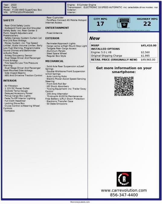 Contact CAR REVOLUTION today for information on dozens of vehicles like this 2023 Ford F-150 XLT. With amenities and luxuries befitting a modern day king, this splendorous coach reigns supreme. This Ford F-150 XLT comes equipped with 4 wheel drive, which means no limitations as to how or where you can drive. Different terrains and varying weather conditions will have no effect as to how this vehicle performs. The quintessential Ford -- This Ford F-150 XLT speaks volumes about its owner, about uncompromising individuality, a passion for driving and standards far above the ordinary. There is no reason why you shouldn't buy this Ford F-150 XLT. It is incomparable for the price and quality. Car Revolution has been in business since 1998 with 2 locations and over 300 cars. A family owned business, focused and determined to extend hospitality to all our clients. We make every effort to present information that is accurate. However, it is based on data provided by the vehicle manufacturer and other sources. Therefore exact Configuration, Color, Certification and Accessories should be used as a guide only and are not guaranteed under any circumstances, for any inaccuracies, claims of losses of any nature. All advertised prices includes all cost to be paid by the consumer, except: Title, Taxes, Registration, License Fees, Insurance, Dealer Prep, Additional Options and include all applicable rebates. Subject to Credit Approval. Every effort is made in order to display accurate and current vehicle information, including Pricing. All vehicles are subjected to prior sale, removal and transport elsewhere, awaiting Title and Ownership Confirmation. Inventory is updated daily and subject to change. Not responsible for typographical errors or omissions. To better insure the specific vehicle's availability, call us right away at 732-527-0477 and feel free to ask any questions. EMG-WB