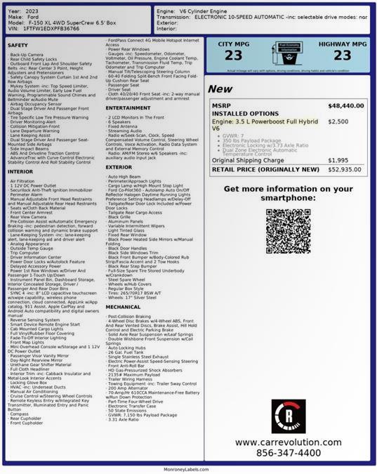 Car Revolution has a wide selection of exceptional pre-owned vehicles to choose from, including this 2023 Ford F-150. This Ford includes: Optional Equipment: Safety and Security External acoustic pedestrian alert Convenience SYNC 4 with Enhanced Voice Recognition (Alexa-Built-In) built-in virtual assistant Original Warranty 96 month/100000 miles Comfort Automatic climate control Dual-zone front climate control SYNC 4 with Enhanced Voice Recognition voice-activated climate control Transmission HYBRID ELEC 10-SPD AUTO TRANS 10-speed automatic Overdrive transmission Lock-up transmission Transmission electronic control Automatic Exterior and Appearance Tough Bed spray-in pickup bed liner Non-metallic paint Class IV tow rating Trailer hitch Front license plate bracket Powertrain and Mechanical Hybrid Lithium ion (Li-ion) PowerBoost HEV (hybrid electric vehicle) Regenerative brakes ECO feedback display gauge Driver selectable rear locking differential 3.5L V-6 port/direct injection, DOHC, variable valve control, twin turbo, regular unleaded, engine with 400HP Engine Cylinders - V6 Twin turbo Exterior FRONT LICENSE PLATE BRACKET Front license plate bracket BEDLINER-TOUGHBED SPRAYIN*ACCY Tough Bed spray-in pickup bed liner DAYTIME RUNNING LAMPS Daytime running lights In-car Entertainment 3 month satellite trial subscription SYNC 4 with Enhanced Voice Recognition voice activated audio controls AM/FM/SiriusXM with 360Lsatellite Additional Options Equipment Group 101A Standard SHIP-THRU NBC TRUCK EQUIPMENT Interior SYNC 4 W/ENHANCED VOICE RECOGN SYNC 4 external memory control SYNC 4 with Enhanced Voice Recognition voice activated audio controls 8 inch primary display Primary monitor touchscreen Connected Navigation integrated navigation system with voice activation SYNC 4 911 Assist emergency SOS system via mobile device SYNC 4 handsfree wireless device connectivity AppLink/Apple CarPlay/Android Auto smart device wireless mirroring SYNC 4 with Enhanced Voice Recognition (Alexa-Built-In) built-in virtual assistant Over the air updates AM/FM/SiriusXM with 360Lsatellite DARK SLATE CLOTH 40/20/40 Dual Zone Electronic Automatic Temperature Control Automatic climate control Air conditioning - Yes Dual-zone front climate control SYNC 4 with Enhanced Voice Recognition voice-activated climate control Engine 3.5L POWERBOOST FULL HYBRID Front mounted engine Regular Unleaded Spark ignition system Longitudinal mounted engine Aluminum engine block Aluminum cylinder head Hybrid Lithium ion (Li-ion) PowerBoost HEV (hybrid electric vehicle) Regenerative brakes Automatic climate control Air conditioning - Yes Dual-zone front climate control SYNC 4 with Enhanced Voice Recognition voice-activated climate control ECO feedback display gauge External acoustic pedestrian alert 3.5L V-6 port/direct injection, DOHC, variable valve control, twin turbo, regular unleaded, engine with 400HP Engine Cylinders - V6 96 month/100000 miles Twin turbo AUTO START-STOP REMOVAL Front mounted engine Regular Unleaded Spark ignition system Variable intake manifold Longitudinal mounted engine Aluminum engine block Aluminum cylinder head Auto stop-start engine LEV3-ULEV125 emissions LEV3-ULEV70 emissions Tier 3 Bin 125 emissions Tier 3 Bin 70 emissions 5L V-8 port/direct injection, DOHC, variable valve control, regular unleaded, engine with 400HP EcoBoost 3.5L V-6 port/direct injection, DOHC, variable valve control, twin turbo, regular unleaded, engine with 400HP EcoBoost V6 Engine Cylinders - V8 Twin turbo Entertainment AM/FM SiriusXM with 360L Radio 3 month satellite trial subscription AM/FM/SiriusXM with 360Lsatellite Paint OXFORD WHITE Non-metallic paint Trailering CLASS IV TRAILER HITCH Trailer wiring harness Class IV tow rating Trailer hitch BLIS with Trailer Tow Coverage blind spot warning Technology and Telematics Connected Navigation integrated navigation system with voice activation Suspension 3.73 ELECTRONIC LOCK RR AXLE Driver selectable rear locking differential *Note - For third party subscriptions or services, please contact the dealer for more information.* Sophistication & understated luxury comes standard on this Ford F-150 XL 4WD SUPERCREW 6.5 BOX. Well-known by many, the F-150 has become a household name in the realm of quality and prestige. No matter the terrain or weather, you'll drive at ease in this 4WD-equipped vehicle. With exceptional safety features and superb handling, this 4WD was engineered with excellence in mind. The Ford F-150 XL 4WD SUPERCREW 6.5 BOX will provide you with everything you have always wanted in a car -- Quality, Reliability, and Character. Car Revolution has been in business since 1998 with 2 locations and over 300 cars. A family owned business, focused and determined to extend hospitality to all our clients. We make every effort to present information that is accurate. However, it is based on data provided by the vehicle manufacturer and other sources. Therefore exact Configuration, Color, Certification and Accessories should be used as a guide only and are not guaranteed under any circumstances, for any inaccuracies, claims of losses of any nature. All advertised prices includes all cost to be paid by the consumer, except: Title, Taxes, Registration, License Fees, Insurance, Dealer Prep, Additional Options and include all applicable rebates. Subject to Credit Approval. Every effort is made in order to display accurate and current vehicle information, including Pricing. All vehicles are subjected to prior sale, removal and transport elsewhere, awaiting Title and Ownership Confirmation. Inventory is updated daily and subject to change. Not responsible for typographical errors or omissions. To better insure the specific vehicle's availability, call us right away at 856-316-3444 and feel free to ask any questions. EMG-WB Thank you for your interest in one of Car Revolution's online offerings. Please continue for more information regarding this 2023 Ford F-150 XL with 104,847mi. This Ford F-150 XL