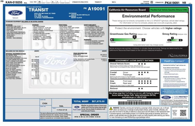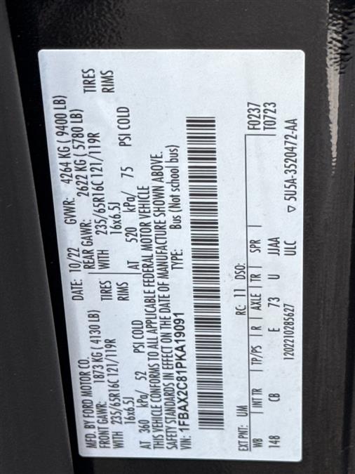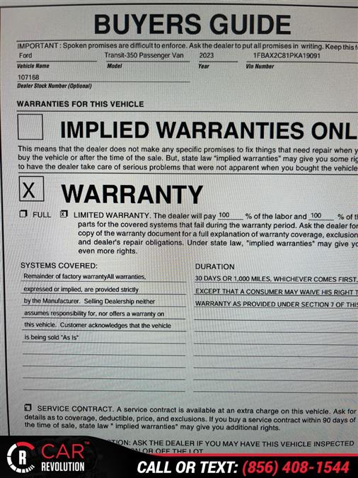 Looking for a clean, well-cared for 2023 Ford Transit-350 Passenger Van? This is it. This Ford includes: Optional Equipment: Safety and Security Back-up alarm Safety BACK UP ALARM Back-up alarm Comfort Seating capacity - 15 Removable fifth-row seats Fifth-row split-bench seat Front facing fifth-row seat Height adjustable fifth-row head restraints Deep tinted windows Manual fifth-row head restraint control 3 fourth-row head restraint(s) 4 fifth-row head restraint(s) Exterior and Appearance Running boards Metallic paint 16 x 6.5-inch front and rear silver aluminum wheels Front license plate bracket Mechanical 9,400 lbs GVWR Seating 2WAY DRV/PASS EBONY CLOTH Bucket front seats Manual driver seat lumbar Driver seat armrest Front passenger seat armrest Driver seat manual reclining, lumbar support and fore/aft control Passenger seat manual reclining and fore/aft control 15-PASSENGER SEATS Seating capacity - 15 Height adjustable fourth-row head restraints Manual fourth-row head restraint control Removable fifth-row seats Fifth-row split-bench seat Front facing fifth-row seat Height adjustable fifth-row head restraints Manual fifth-row head restraint control 3 fourth-row head restraint(s) 4 fifth-row head restraint(s) Tires & Wheels SILVER ALUMINUM WHEEL 16 x 6.5-inch front and rear silver aluminum wheels Exterior FRONT LICENSE PLATE BRACKET Front license plate bracket RUNNING BOARD Running boards PRIVACY GLASS Deep tinted windows Additional Options Order Code 302A In-car Entertainment 3 month satellite trial subscription AM/FM/digital/SiriusXM with 360Lsatellite Interior EBONY CLOTH Intelligent Speed Assist (ISA) Intelligent Speed Assist traffic sign recognition with automatic speed limit assist Traffic Sign Recognition (TSR) Traffic sign recognition with automatic speed limit assist Engine AUTO START STOP REMOVAL Entertainment SYNC 4 NAVIGATION Automatic climate control Air conditioning - Yes SYNC 4 external memory control 3 month satellite trial subscription SYNC 4 with Enhanced Voice Recognition voice activated audio controls 12 inch primary display Connected Navigation integrated navigation system with voice activation 911 Assist emergency SOS system via mobile device SYNC 4 AppLink/Apple CarPlay/Android Auto smart device app link 5 USB ports Intelligent Speed Assist traffic sign recognition with automatic speed limit assist Traffic sign recognition with automatic speed limit assist AM/FM/digital/SiriusXM with 360Lsatellite Paint AGATE BLACK METALLIC Metallic paint *Note - For third party subscriptions or services, please contact the dealer for more information.* There's a level of quality and refinement in this Ford Transit-350 Passenger Van XLT MED ROOF 15 that you won't find in your average vehicle. Surprising quality accompanied by a high level of performance...this Agate Black Metallic on Ebony Ford Transit-350 Passenger Van XLT MED ROOF 15 could end up being the perfect match for you. This Agate Black Metallic Ford is clean and shiny exterior makes it look like it came straight from the factory. Car Revolution has been in business since 1998 with 2 locations and over 300 cars. A family owned business, focused and determined to extend hospitality to all our clients. We make every effort to present information that is accurate. However, it is based on data provided by the vehicle manufacturer and other sources. Therefore exact Configuration, Color, Certification and Accessories should be used as a guide only and are not guaranteed under any circumstances, for any inaccuracies, claims of losses of any nature. All advertised prices includes all cost to be paid by the consumer, except: Title, Taxes, Registration, License Fees, Insurance, Dealer Prep, Additional Options and include all applicable rebates. Subject to Credit Approval. Every effort is made in order to display accurate and current vehicle information, including Pricing. All vehicles are subjected to prior sale, removal and transport elsewhere, awaiting Title and Ownership Confirmation. Inventory is updated daily and subject to change. Not responsible for typographical errors or omissions. To better insure the specific vehicle's availability, call us right away at 856-316-3444 and feel free to ask any questions. EMG-WB Check out this pre-owned 2023 Ford Transit Passenger Wagon we recently got in. Put performance, safety, beauty, sophistication and all the right amenities into a car, and here it is! Now you can own luxury without the luxury price tag! You can finally stop searching... You've found the one you've been looking for. There is no reason why you shouldn't buy this Ford Transit Passenger Wagon XLT. It is incomparable for the price and quality. The quintessential Ford -- This Ford Transit Passenger Wagon XLT speaks volumes about its owner, about uncompromising individuality, a passion for driving and standards far above the ordinary. Car Revolution has been in business since 1998 with 2 locations and over 300 cars. A family owned business, focused and determined to extend hospitality to all our clients. We make every effort to present information that is accurate. However, it is based on data provided by the vehicle manufacturer and other sources. Therefore exact Configuration, Color, Certification and Accessories should be used as a guide only and are not guaranteed under any circumstances, for any inaccuracies, claims of losses of any nature. All advertised prices includes all cost to be paid by the consumer, except: Title, Taxes, Registration, License Fees, Insurance, Dealer Prep, Additional Options and include all applicable rebates. Subject to Credit Approval. Every effort is made in order to display accurate and current vehicle information, including Pricing. All vehicles are subjected to prior sale, removal and transport elsewhere, awaiting Title and Ownership Confirmation. Inventory is updated daily and subject to change. Not responsible for typographical errors or omissions. To better insure the specific vehicle