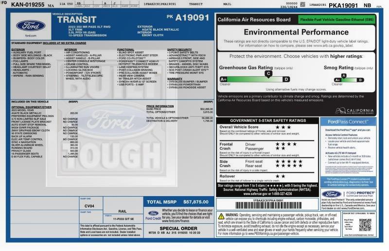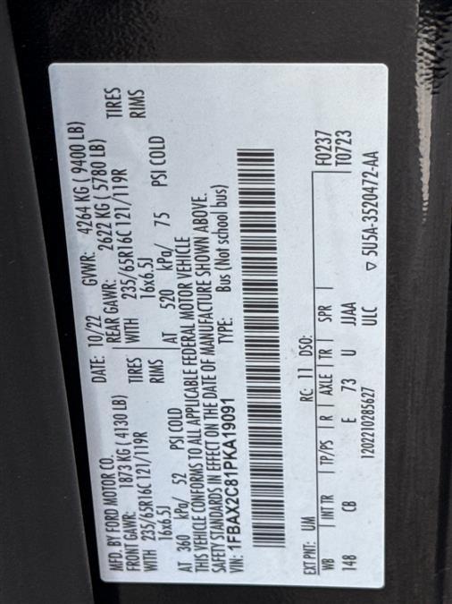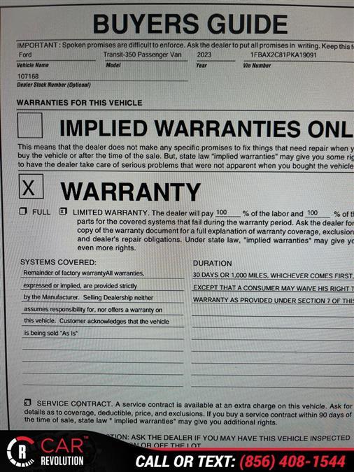 Looking for a clean, well-cared for 2023 Ford Transit-350 Passenger Van? This is it. This Ford includes: Optional Equipment: Safety and Security Back-up alarm Safety BACK UP ALARM Back-up alarm Comfort Seating capacity - 15 Removable fifth-row seats Fifth-row split-bench seat Front facing fifth-row seat Height adjustable fifth-row head restraints Deep tinted windows Manual fifth-row head restraint control 3 fourth-row head restraint(s) 4 fifth-row head restraint(s) Exterior and Appearance Running boards Metallic paint 16 x 6.5-inch front and rear silver aluminum wheels Front license plate bracket Mechanical 9,400 lbs GVWR Seating 2WAY DRV/PASS EBONY CLOTH Bucket front seats Manual driver seat lumbar Driver seat armrest Front passenger seat armrest Driver seat manual reclining, lumbar support and fore/aft control Passenger seat manual reclining and fore/aft control 15-PASSENGER SEATS Seating capacity - 15 Height adjustable fourth-row head restraints Manual fourth-row head restraint control Removable fifth-row seats Fifth-row split-bench seat Front facing fifth-row seat Height adjustable fifth-row head restraints Manual fifth-row head restraint control 3 fourth-row head restraint(s) 4 fifth-row head restraint(s) Tires & Wheels SILVER ALUMINUM WHEEL 16 x 6.5-inch front and rear silver aluminum wheels Exterior FRONT LICENSE PLATE BRACKET Front license plate bracket RUNNING BOARD Running boards PRIVACY GLASS Deep tinted windows Additional Options Order Code 302A In-car Entertainment 3 month satellite trial subscription AM/FM/digital/SiriusXM with 360Lsatellite Interior EBONY CLOTH Intelligent Speed Assist (ISA) Intelligent Speed Assist traffic sign recognition with automatic speed limit assist Traffic Sign Recognition (TSR) Traffic sign recognition with automatic speed limit assist Engine AUTO START STOP REMOVAL Entertainment SYNC 4 NAVIGATION Automatic climate control Air conditioning - Yes SYNC 4 external memory control 3 month satellite trial subscription SYNC 4 with Enhanced Voice Recognition voice activated audio controls 12 inch primary display Connected Navigation integrated navigation system with voice activation 911 Assist emergency SOS system via mobile device SYNC 4 AppLink/Apple CarPlay/Android Auto smart device app link 5 USB ports Intelligent Speed Assist traffic sign recognition with automatic speed limit assist Traffic sign recognition with automatic speed limit assist AM/FM/digital/SiriusXM with 360Lsatellite Paint AGATE BLACK METALLIC Metallic paint *Note - For third party subscriptions or services, please contact the dealer for more information.* There's a level of quality and refinement in this Ford Transit-350 Passenger Van XLT MED ROOF 15 that you won't find in your average vehicle. Surprising quality accompanied by a high level of performance...this Agate Black Metallic on Ebony Ford Transit-350 Passenger Van XLT MED ROOF 15 could end up being the perfect match for you. This Agate Black Metallic Ford is clean and shiny exterior makes it look like it came straight from the factory. Car Revolution has been in business since 1998 with 2 locations and over 300 cars. A family owned business, focused and determined to extend hospitality to all our clients. We make every effort to present information that is accurate. However, it is based on data provided by the vehicle manufacturer and other sources. Therefore exact Configuration, Color, Certification and Accessories should be used as a guide only and are not guaranteed under any circumstances, for any inaccuracies, claims of losses of any nature. All advertised prices includes all cost to be paid by the consumer, except: Title, Taxes, Registration, License Fees, Insurance, Dealer Prep, Additional Options and include all applicable rebates. Subject to Credit Approval. Every effort is made in order to display accurate and current vehicle information, including Pricing. All vehicles are subjected to prior sale, removal and transport elsewhere, awaiting Title and Ownership Confirmation. Inventory is updated daily and subject to change. Not responsible for typographical errors or omissions. To better insure the specific vehicle's availability, call us right away at 856-316-3444 and feel free to ask any questions. EMG-WB Check out this pre-owned 2023 Ford Transit Passenger Wagon we recently got in. Put performance, safety, beauty, sophistication and all the right amenities into a car, and here it is! Now you can own luxury without the luxury price tag! You can finally stop searching... You've found the one you've been looking for. There is no reason why you shouldn't buy this Ford Transit Passenger Wagon XLT. It is incomparable for the price and quality. The quintessential Ford -- This Ford Transit Passenger Wagon XLT speaks volumes about its owner, about uncompromising individuality, a passion for driving and standards far above the ordinary. Car Revolution has been in business since 1998 with 2 locations and over 300 cars. A family owned business, focused and determined to extend hospitality to all our clients. We make every effort to present information that is accurate. However, it is based on data provided by the vehicle manufacturer and other sources. Therefore exact Configuration, Color, Certification and Accessories should be used as a guide only and are not guaranteed under any circumstances, for any inaccuracies, claims of losses of any nature. All advertised prices includes all cost to be paid by the consumer, except: Title, Taxes, Registration, License Fees, Insurance, Dealer Prep, Additional Options and include all applicable rebates. Subject to Credit Approval. Every effort is made in order to display accurate and current vehicle information, including Pricing. All vehicles are subjected to prior sale, removal and transport elsewhere, awaiting Title and Ownership Confirmation. Inventory is updated daily and subject to change. Not responsible for typographical errors or omissions. To better insure the specific vehicle