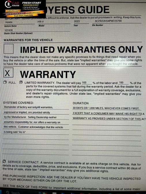 Car Revolution is honored to present a wonderful example of pure vehicle design... this 2023 Honda HR-V Sport only has 25,550mi on it and could potentially be the vehicle of your dreams! On almost any road condition, this Honda HR-V Sport offers solid performance, reliability, and comfort. Comfort. Performance. Safety. Enjoy all three with this well-appointed AWD 2023 Honda. The HR-V Sport is well maintained and has just 25,550mi. This low amount of miles makes this vehicle incomparable to the competition. The Honda HR-V Sport will provide you with everything you have always wanted in a car -- Quality, Reliability, and Character. Car Revolution has been in business since 1998 with 2 locations and over 300 cars. A family owned business, focused and determined to extend hospitality to all our clients. We make every effort to present information that is accurate. However, it is based on data provided by the vehicle manufacturer and other sources. Therefore exact Configuration, Color, Certification and Accessories should be used as a guide only and are not guaranteed under any circumstances, for any inaccuracies, claims of losses of any nature. All advertised prices includes all cost to be paid by the consumer, except: Title, Taxes, Registration, License Fees, Insurance, Dealer Prep, Additional Options and include all applicable rebates. Subject to Credit Approval. Every effort is made in order to display accurate and current vehicle information, including Pricing. All vehicles are subjected to prior sale, removal and transport elsewhere, awaiting Title and Ownership Confirmation. Inventory is updated daily and subject to change. Not responsible for typographical errors or omissions. To better insure the specific vehicle's availability, call us right away at 856-316-3444 and feel free to ask any questions. EMG-WB