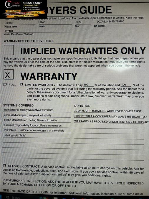 Car Revolution is honored to present a wonderful example of pure vehicle design... this 2023 Honda HR-V Sport only has 25,550mi on it and could potentially be the vehicle of your dreams! On almost any road condition, this Honda HR-V Sport offers solid performance, reliability, and comfort. Comfort. Performance. Safety. Enjoy all three with this well-appointed AWD 2023 Honda. The HR-V Sport is well maintained and has just 25,550mi. This low amount of miles makes this vehicle incomparable to the competition. The Honda HR-V Sport will provide you with everything you have always wanted in a car -- Quality, Reliability, and Character. Car Revolution has been in business since 1998 with 2 locations and over 300 cars. A family owned business, focused and determined to extend hospitality to all our clients. We make every effort to present information that is accurate. However, it is based on data provided by the vehicle manufacturer and other sources. Therefore exact Configuration, Color, Certification and Accessories should be used as a guide only and are not guaranteed under any circumstances, for any inaccuracies, claims of losses of any nature. All advertised prices includes all cost to be paid by the consumer, except: Title, Taxes, Registration, License Fees, Insurance, Dealer Prep, Additional Options and include all applicable rebates. Subject to Credit Approval. Every effort is made in order to display accurate and current vehicle information, including Pricing. All vehicles are subjected to prior sale, removal and transport elsewhere, awaiting Title and Ownership Confirmation. Inventory is updated daily and subject to change. Not responsible for typographical errors or omissions. To better insure the specific vehicle's availability, call us right away at 856-316-3444 and feel free to ask any questions. EMG-WB
