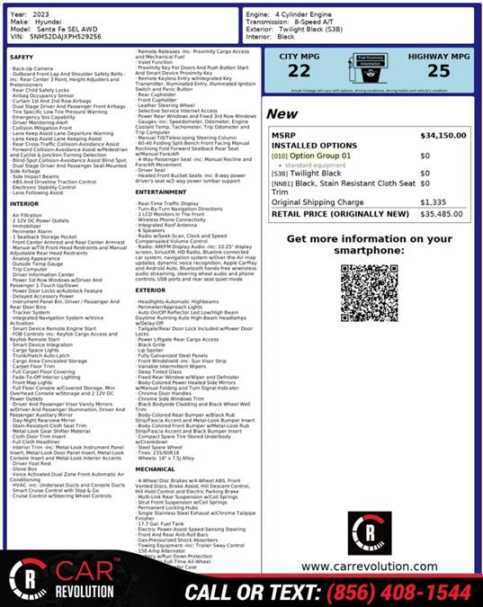 This 2023 Hyundai Santa Fe SEL AWD is offered to you for sale by Car Revolution. This Hyundai includes: Optional Equipment: Interior Black Exterior and Appearance Pearlcoat paint Paint Twilight Black Pearlcoat paint Additional Options Option Group 01 *Note - For third party subscriptions or services, please contact the dealer for more information.* The Hyundai Santa Fe SEL AWD offers a fair amount of utility thanks to its advanced features and unique styling. It's also quite sporty, and injects an ample amount of handling chutzpah into the ridin'-high body of a family-friendly SUV. When driving an all wheel drive vehicle, such as this Hyundai Santa Fe SEL AWD, superior acceleration, traction, and control come standard. You'll quickly realize how much you will need a navigation system once you are stopping for directions or looking up addresses on your phone instead of looking at the road. This Hyundai Santa Fe SEL AWD features a navigation system that will free you of these unnecessary headaches. Car Revolution has been in business since 1998 with 2 locations and over 300 cars. A family owned business, focused and determined to extend hospitality to all our clients. We make every effort to present information that is accurate. However, it is based on data provided by the vehicle manufacturer and other sources. Therefore exact Configuration, Color, Certification and Accessories should be used as a guide only and are not guaranteed under any circumstances, for any inaccuracies, claims of losses of any nature. All advertised prices includes all cost to be paid by the consumer, except: Title, Taxes, Registration, License Fees, Insurance, Dealer Prep, Additional Options and include all applicable rebates. Subject to Credit Approval. Every effort is made in order to display accurate and current vehicle information, including Pricing. All vehicles are subjected to prior sale, removal and transport elsewhere, awaiting Title and Ownership Confirmation. Inventory is updated daily and subject to change. Not responsible for typographical errors or omissions. To better insure the specific vehicle's availability, call us right away at 856-316-3444 and feel free to ask any questions. EMG-WB Contact Car Revolution today for information on dozens of vehicles like this 2023 Hyundai Santa Fe SEL. The Hyundai Santa Fe SEL offers a fair amount of utility thanks to its advanced features and unique styling. It's also quite sporty, and injects an ample amount of handling chutzpah into the ridin'-high body of a family-friendly SUV. This AWD-equipped vehicle handles well in any weather condition or terrain. You'll benefit from superb handling, improved steering and excellent acceleration. There is no reason why you shouldn't buy this Hyundai Santa Fe SEL. It is incomparable for the price and quality. The Hyundai Santa Fe SEL will provide you with everything you have always wanted in a car -- Quality, Reliability, and Character. Car Revolution has been in business since 1998 with 2 locations and over 300 cars. A family owned business, focused and determined to extend hospitality to all our clients. We make every effort to present information that is accurate. However, it is based on data provided by the vehicle manufacturer and other sources. Therefore exact Configuration, Color, Certification and Accessories should be used as a guide only and are not guaranteed under any circumstances, for any inaccuracies, claims of losses of any nature. All advertised prices includes all cost to be paid by the consumer, except: Title, Taxes, Registration, License Fees, Insurance, Dealer Prep, Additional Options and include all applicable rebates. Subject to Credit Approval. Every effort is made in order to display accurate and current vehicle information, including Pricing. All vehicles are subjected to prior sale, removal and transport elsewhere, awaiting Title and Ownership Confirmation. Inventory is updated daily and subject to change. Not responsible for typographical errors or omissions. To better insure the specific vehicle's availability, call us right away at 856-316-3444 and feel free to ask any questions. EMG-WB