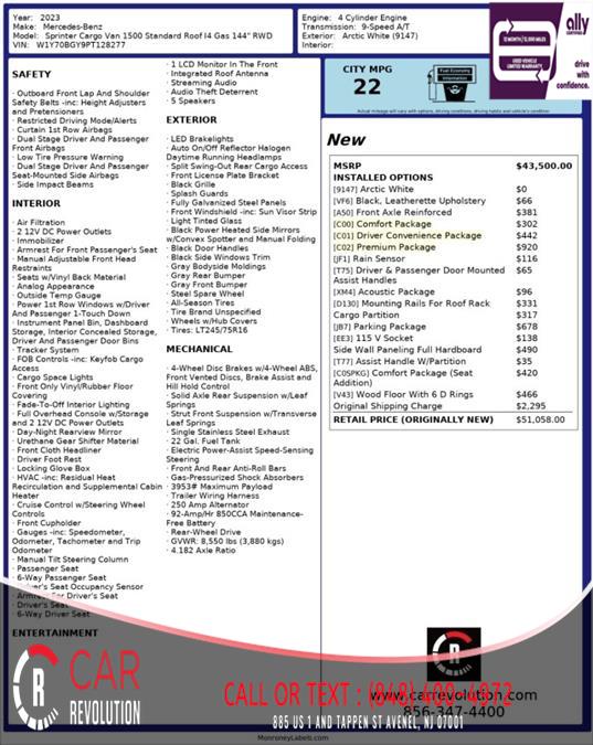 CAR REVOLUTION has a wide selection of exceptional pre-owned vehicles to choose from, including this 2023 Mercedes-Benz Sprinter Cargo Van. Indulge yourself with one of the most highly crafted, most luxurious automobiles available today. Exceptional in every sense of the word, this incredibly low mileage vehicle is one of a kind. You could keep looking, but why? You've found the perfect vehicle right here. This is the one. Just what you've been looking for. Car Revolution has been in business since 1998 with 2 locations and over 300 cars. A family owned business, focused and determined to extend hospitality to all our clients. We make every effort to present information that is accurate. However, it is based on data provided by the vehicle manufacturer and other sources. Therefore exact Configuration, Color, Certification and Accessories should be used as a guide only and are not guaranteed under any circumstances, for any inaccuracies, claims of losses of any nature. All advertised prices includes all cost to be paid by the consumer, except: Title, Taxes, Registration, License Fees, Insurance, Dealer Prep, Additional Options and include all applicable rebates. Subject to Credit Approval. Every effort is made in order to display accurate and current vehicle information, including Pricing. All vehicles are subjected to prior sale, removal and transport elsewhere, awaiting Title and Ownership Confirmation. Inventory is updated daily and subject to change. Not responsible for typographical errors or omissions. To better insure the specific vehicle's availability, call us right away at 732-527-0477 and feel free to ask any questions. EMG-WB