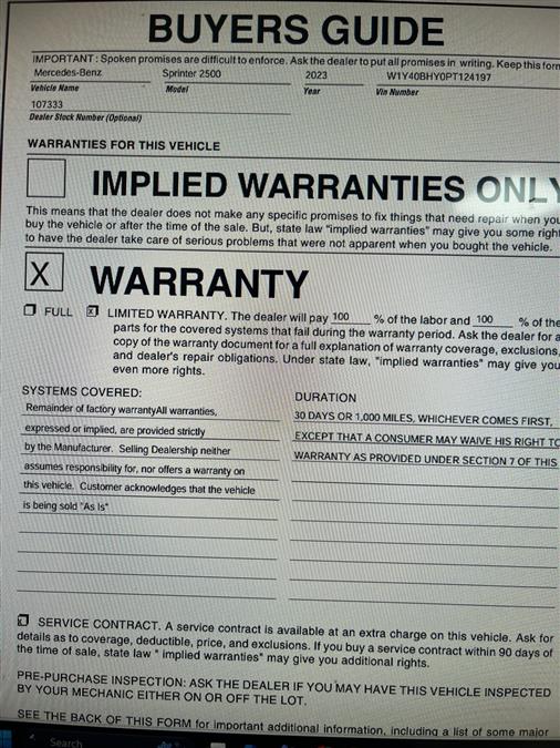 This 2023 Mercedes-Benz Sprinter 2500 Standard Roof 4-Cyl Gas 144 is offered to you for sale by Car Revolution. This Mercedes-Benz includes: Optional Equipment: Safety and Security Front cornering lights Blind Spot Assist ATTENTION ASSIST driver attention alert Front fog lights Convenience Wood cargo area floor Cargo area partition 3 12V power outlets 1 interior 120V AC power outlet Power folding door mirrors Comfort Seating capacity - 3 Driver bucket and passenger bench seat ARTICO leatherette front seat upholstery Exterior and Appearance Metallic paint Rear bumper step Seating Artico Man-Made Leather Black ARTICO leatherette front seat upholstery Twin front passenger seat Seating capacity - 3 Driver bucket and passenger bench seat Driver seat armrest Armrest, driver's and co-drive Tires & Wheels Tire brand Michelin Specially requested tires Exterior Rear spring vibration absorber High roof Sliding left rear passenger door 4 doors Electrically Folding Exterior Mirrors Power folding door mirrors Fog lamp with cornering light Front cornering lights Front fog lights Door-mounted assist handles, d Rear doors, opening to side wa Split swing-out rear cargo door Bumper step, rear, grey Gray rear bumper Rear bumper step Additional Options Driver Seat Base 12V Power Outlet 3 12V power outlets In-car Entertainment MBUX voice activated audio controls 7 inch primary display Primary monitor touchscreen Interior Cargo partition with 1 window Cargo area partition 115 V socket 1 interior 120V AC power outlet Interior rear view mirror Day/Night rearview mirror Rear window defroster Fixed rear windshield Rear windshield wipers Storage Compartment Hinged Lid Rear view camera (head unit di Rear mounted camera Optional 3-button keys All-in-one remote fob and ignition key Smart device-as-key proximity door locks 2 Additional Master Keys Blind Spot Assist Blind Spot Assist Instrument cluster with color 2 total number of 1st row displays Gauge cluster display size: 5.50 ATTENTION ASSIST ATTENTION ASSIST driver attention alert Assist handle w/ partition Wood floor with 6 D-rings Wood cargo area floor Cargo area tie downs Side wall paneling full hardbo Hinged Lid For Left and Right Storage Compartments Entertainment MBUX MULTIMEDIA SYSTEM WITH 7 External memory control MBUX voice activated audio controls Bluetooth wireless audio streaming 1 total number of 1st row displays 7 inch primary display Primary monitor touchscreen Bluetooth handsfree wireless device connectivity Apple CarPlay/Android Auto smart device mirroring 1 USB port AM/FM Paint iridium silver metallic Metallic paint Technology and Telematics Apple CarPlay/Android Auto smart device mirroring *Note - For third party subscriptions or services, please contact the dealer for more information.* Outstanding craftsmanship and artisanal refinements abound with this Mercedes-Benz Sprinter 2500 Standard Roof 4-Cyl Gas 144. The Mercedes-Benz Sprinter 2500 Standard Roof 4-Cyl Gas 144 will provide you with everything you have always wanted in a car -- Quality, Reliability, and Character. Beautiful color combination with Iridium Silver exterior over Artico Man-Made Leather Black-VF6 (VF6) interior making this the one to own! Car Revolution has been in business since 1998 with 2 locations and over 300 cars. A family owned business, focused and determined to extend hospitality to all our clients. We make every effort to present information that is accurate. However, it is based on data provided by the vehicle manufacturer and other sources. Therefore exact Configuration, Color, Certification and Accessories should be used as a guide only and are not guaranteed under any circumstances, for any inaccuracies, claims of losses of any nature. All advertised prices includes all cost to be paid by the consumer, except: Title, Taxes, Registration, License Fees, Insurance, Dealer Prep, Additional Options and include all applicable rebates. Subject to Credit Approval. Every effort is made in order to display accurate and current vehicle information, including Pricing. All vehicles are subjected to prior sale, removal and transport elsewhere, awaiting Title and Ownership Confirmation. Inventory is updated daily and subject to change. Not responsible for typographical errors or omissions. To better insure the specific vehicle's availability, call us right away at 856-316-3444 and feel free to ask any questions. EMG-WB Car Revolution has a wide selection of exceptional pre-owned vehicles to choose from, including this 2023 Mercedes-Benz Sprinter Cargo Van. This Mercedes-Benz Sprinter Cargo Van is for the discerning driver who demands the utmost of his vehicle. There is no reason why you shouldn't buy this Mercedes-Benz Sprinter Cargo Van . It is incomparable for the price and quality. A truly breathtaking example of pure vehicle design achievement...this is the vehicle of your dreams! Based on the superb condition of this vehicle, along with the options and color, this Mercedes-Benz Sprinter Cargo Van is sure to sell fast. Car Revolution has been in business since 1998 with 2 locations and over 300 cars. A family owned business, focused and determined to extend hospitality to all our clients. We make every effort to present information that is accurate. However, it is based on data provided by the vehicle manufacturer and other sources. Therefore exact Configuration, Color, Certification and Accessories should be used as a guide only and are not guaranteed under any circumstances, for any inaccuracies, claims of losses of any nature. All advertised prices includes all cost to be paid by the consumer, except: Title, Taxes, Registration, License Fees, Insurance, Dealer Prep, Additional Options and include all applicable rebates. Subject to Credit Approval. Every effort is made in order to display accurate and current vehicle information, including Pricing. All vehicles are subjected to prior sale, removal and transport elsewhere, awaiting Title and Ownership Confirmation. Invent