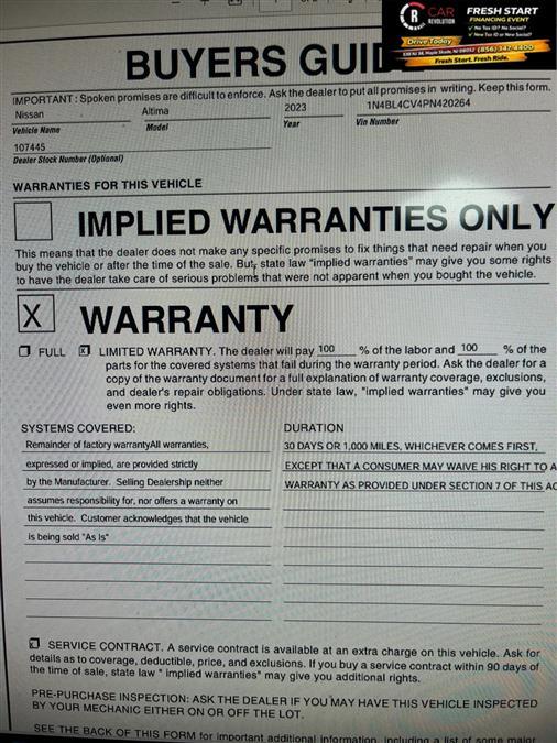 Car Revolution has a wide selection of exceptional pre-owned vehicles to choose from, including this 2023 Nissan Altima. This Nissan includes: Optional Equipment: Interior Tech Spec Change SR Floor Mats/trunk Mat/hideaway Nets Carpet front and rear floor mats Carpet cargo mat Cargo net Sport Convenience Carpet cargo mat Cargo net Comfort Carpet front and rear floor mats Exterior and Appearance Non-metallic paint Paint Super Black Non-metallic paint Emissions 50 State Emissions LEV3-SULEV30 emissions Tier 3 Bin 30 emissions *Note - For third party subscriptions or services, please contact the dealer for more information.* Everyone hates the gas pump. Skip a few gas stations with this super fuel efficient NissanAltima. Driven by many, but adored by more, the Nissan Altima 2.5 SR is a perfect addition to any home. This is about the time when you're saying it is too good to be true, and let us be the one's to tell you, it is absolutely true. Car Revolution has been in business since 1998 with 2 locations and over 300 cars. A family owned business, focused and determined to extend hospitality to all our clients. We make every effort to present information that is accurate. However, it is based on data provided by the vehicle manufacturer and other sources. Therefore exact Configuration, Color, Certification and Accessories should be used as a guide only and are not guaranteed under any circumstances, for any inaccuracies, claims of losses of any nature. All advertised prices includes all cost to be paid by the consumer, except: Title, Taxes, Registration, License Fees, Insurance, Dealer Prep, Additional Options and include all applicable rebates. Subject to Credit Approval. Every effort is made in order to display accurate and current vehicle information, including Pricing. All vehicles are subjected to prior sale, removal and transport elsewhere, awaiting Title and Ownership Confirmation. Inventory is updated daily and subject to change. Not responsible for typographical errors or omissions. To better insure the specific vehicle's availability, call us right away at 856-316-3444 and feel free to ask any questions. EMG-WB This 2023 Nissan Altima 2.5 SR is offered to you for sale by Car Revolution. Save money at the pump with this fuel-sipping Nissan Altima. You can finally stop searching... You've found the one you've been looking for. Just what you've been looking for. With quality in mind, this vehicle is the perfect addition to take home. Based on the superb condition of this vehicle, along with the options and color, this Nissan Altima 2.5 SR is sure to sell fast. Car Revolution has been in business since 1998 with 2 locations and over 300 cars. A family owned business, focused and determined to extend hospitality to all our clients. We make every effort to present information that is accurate. However, it is based on data provided by the vehicle manufacturer and other sources. Therefore exact Configuration, Color, Certification and Accessories should be used as a guide only and are not guaranteed under any circumstances, for any inaccuracies, claims of losses of any nature. All advertised prices includes all cost to be paid by the consumer, except: Title, Taxes, Registration, License Fees, Insurance, Dealer Prep, Additional Options and include all applicable rebates. Subject to Credit Approval. Every effort is made in order to display accurate and current vehicle information, including Pricing. All vehicles are subjected to prior sale, removal and transport elsewhere, awaiting Title and Ownership Confirmation. Inventory is updated daily and subject to change. Not responsible for typographical errors or omissions. To better insure the specific vehicle's availability, call us right away at 856-316-3444 and feel free to ask any questions. EMG-WB