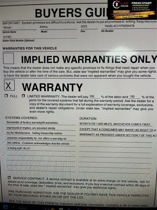 Contact Car Revolution today for information on dozens of vehicles like this 2023 Nissan Altima 2.5 SR. This Nissan includes: Optional Equipment: Interior Tech Spec Change SR Floor Mats/trunk Mat/hideaway Nets Carpet front and rear floor mats Carpet cargo mat Cargo net Sport Convenience Carpet cargo mat Cargo net Comfort Carpet front and rear floor mats Exterior and Appearance Metallic paint Paint Gun Metallic Metallic paint Emissions 50 State Emissions LEV3-SULEV30 emissions Tier 3 Bin 30 emissions *Note - For third party subscriptions or services, please contact the dealer for more information.* This wonderfully fuel-efficient vehicle offers a supple ride, quick acceleration and superior styling without sacrificing MPGs. You've found the one you've been looking for. Your dream car. Beautiful color combination with Gun Metallic exterior over Sport interior making this the one to own! Car Revolution has been in business since 1998 with 2 locations and over 300 cars. A family owned business, focused and determined to extend hospitality to all our clients. We make every effort to present information that is accurate. However, it is based on data provided by the vehicle manufacturer and other sources. Therefore exact Configuration, Color, Certification and Accessories should be used as a guide only and are not guaranteed under any circumstances, for any inaccuracies, claims of losses of any nature. All advertised prices includes all cost to be paid by the consumer, except: Title, Taxes, Registration, License Fees, Insurance, Dealer Prep, Additional Options and include all applicable rebates. Subject to Credit Approval. Every effort is made in order to display accurate and current vehicle information, including Pricing. All vehicles are subjected to prior sale, removal and transport elsewhere, awaiting Title and Ownership Confirmation. Inventory is updated daily and subject to change. Not responsible for typographical errors or omissions. To better insure the specific vehicle's availability, call us right away at 856-316-3444 and feel free to ask any questions. EMG-WB Thank you for your interest in one of Car Revolution's online offerings. Please continue for more information regarding this 2023 Nissan Altima 2.5 SR with 66,606mi. This 2023 Nissan Altima has great acceleration and wonderful styling without sacrificing exceptional fuel economy. Driven by many, but adored by more, the Nissan Altima 2.5 SR is a perfect addition to any home. You could keep looking, but why? You've found the perfect vehicle right here. Look no further, you have found exactly what you've been looking for. Car Revolution has been in business since 1998 with 2 locations and over 300 cars. A family owned business, focused and determined to extend hospitality to all our clients. We make every effort to present information that is accurate. However, it is based on data provided by the vehicle manufacturer and other sources. Therefore exact Configuration, Color, Certification and Accessories should be used as a guide only and are not guaranteed under any circumstances, for any inaccuracies, claims of losses of any nature. All advertised prices includes all cost to be paid by the consumer, except: Title, Taxes, Registration, License Fees, Insurance, Dealer Prep, Additional Options and include all applicable rebates. Subject to Credit Approval. Every effort is made in order to display accurate and current vehicle information, including Pricing. All vehicles are subjected to prior sale, removal and transport elsewhere, awaiting Title and Ownership Confirmation. Inventory is updated daily and subject to change. Not responsible for typographical errors or omissions. To better insure the specific vehicle's availability, call us right away at 856-316-3444 and feel free to ask any questions. EMG-WB