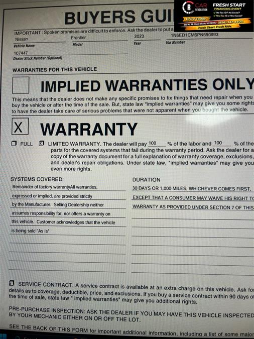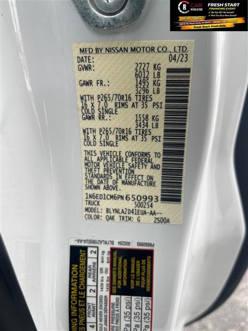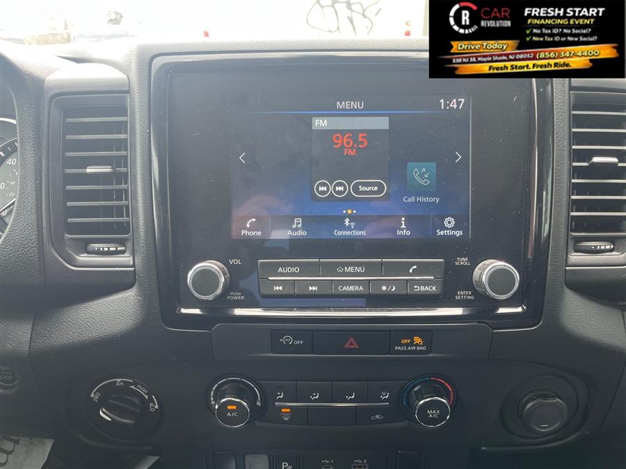 This 2023 Nissan Frontier S is offered to you for sale by Car Revolution. This Nissan includes: Optional Equipment: Safety and Security Lane Departure Warning (LDW) Blind Spot Warning (BSW) High Beam Assist (HBA) auto high-beam headlights Rear parking sensors Interior Charcoal Blind Spot Warning (BSW) Blind Spot Warning (BSW) Intelligent Cruise Control (ICC) Cruise control with steering wheel mounted controls Intelligent Cruise Control (ICC) Lane Departure Warning (LDW) Lane Departure Warning (LDW) Rear Automatic Braking (RAB) Rear Automatic Braking (RAB) collision mitigation Rear Cross Traffic Alert (RCTA) Rear Cross Traffic Alert (RCTA) w/Rear Automatic Braking (RAB) collision mitigation Rear Sonar System Rear parking sensors Convenience Intelligent Cruise Control (ICC) Exterior and Appearance Non-metallic paint Paint Glacier White Non-metallic paint Emissions 50 State Emissions LEV3-ULEV70 emissions Tier 3 Bin 70 emissions Exterior High Beam Assist (HBA) High Beam Assist (HBA) auto high-beam headlights Additional Options Technology Package Cruise control with steering wheel mounted controls Intelligent Cruise Control (ICC) Lane Departure Warning (LDW) Blind Spot Warning (BSW) Rear Automatic Braking (RAB) collision mitigation Rear Cross Traffic Alert (RCTA) w/Rear Automatic Braking (RAB) collision mitigation High Beam Assist (HBA) auto high-beam headlights Rear parking sensors *Note - For third party subscriptions or services, please contact the dealer for more information.* At home in the country and in the city, this 2023 4WD Nissan Frontier S has been wonderfully refined to handle any occasion. Smooth steering, superior acceleration and a supple ride are just a few of its qualities. Look no further, you have found exactly what you've been looking for. Surprising quality accompanied by a high level of performance...this Glacier White on Charcoal Nissan Frontier S could end up being the perfect match for you. Car Revolution has been in business since 1998 with 2 locations and over 300 cars. A family owned business, focused and determined to extend hospitality to all our clients. We make every effort to present information that is accurate. However, it is based on data provided by the vehicle manufacturer and other sources. Therefore exact Configuration, Color, Certification and Accessories should be used as a guide only and are not guaranteed under any circumstances, for any inaccuracies, claims of losses of any nature. All advertised prices includes all cost to be paid by the consumer, except: Title, Taxes, Registration, License Fees, Insurance, Dealer Prep, Additional Options and include all applicable rebates. Subject to Credit Approval. Every effort is made in order to display accurate and current vehicle information, including Pricing. All vehicles are subjected to prior sale, removal and transport elsewhere, awaiting Title and Ownership Confirmation. Inventory is updated daily and subject to change. Not responsible for typographical errors or omissions. To better insure the specific vehicle's availability, call us right away at 856-316-3444 and feel free to ask any questions. EMG-WB You can find this 2023 Nissan Frontier S and many others like it at Car Revolution. This vehicle comes with 4WD for better traction on unstable surfaces, like snow and dirt to give you the edge over anything you might encounter on the road. Just what you've been looking for. With quality in mind, this vehicle is the perfect addition to take home. The Nissan Frontier S will provide you with everything you have always wanted in a car -- Quality, Reliability, and Character. The quintessential Nissan -- This Nissan Frontier S speaks volumes about its owner, about uncompromising individuality, a passion for driving and standards far above the ordinary. Car Revolution has been in business since 1998 with 2 locations and over 300 cars. A family owned business, focused and determined to extend hospitality to all our clients. We make every effort to present information that is accurate. However, it is based on data provided by the vehicle manufacturer and other sources. Therefore exact Configuration, Color, Certification and Accessories should be used as a guide only and are not guaranteed under any circumstances, for any inaccuracies, claims of losses of any nature. All advertised prices includes all cost to be paid by the consumer, except: Title, Taxes, Registration, License Fees, Insurance, Dealer Prep, Additional Options and include all applicable rebates. Subject to Credit Approval. Every effort is made in order to display accurate and current vehicle information, including Pricing. All vehicles are subjected to prior sale, removal and transport elsewhere, awaiting Title and Ownership Confirmation. Inventory is updated daily and subject to change. Not responsible for typographical errors or omissions. To better insure the specific vehicle's availability, call us right away at 856-316-3444 and feel free to ask any questions. EMG-WB