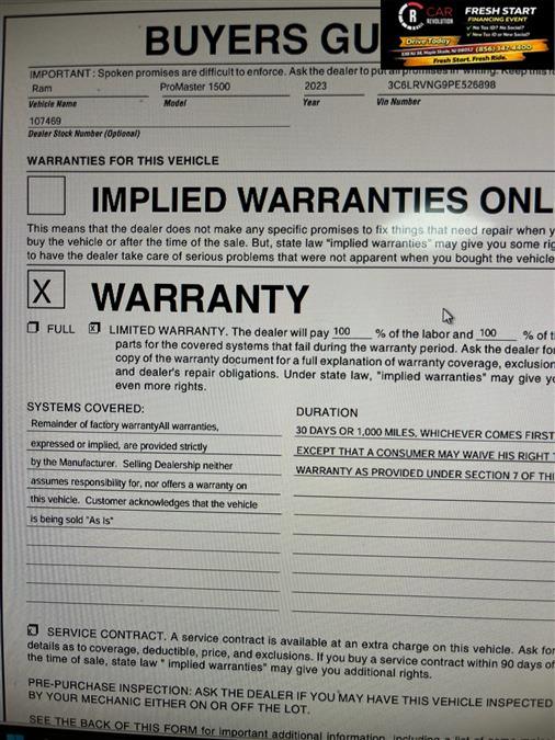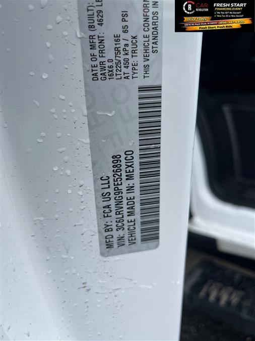Check out this pre-owned 2023 Ram ProMaster 1500 we recently got in. This Ram includes: Optional Equipment: Safety and Security Front fog lights Convenience Power door mirrors Heated driver and passenger side door mirrors Front under seat tray Cargo net Supplemental cargo area lighting Cruise control with steering wheel mounted controls 1 interior 120V AC power outlet Fixed rear windshield Day/Night rearview mirror Ambient lighting Comfort Seating capacity - 2 Front passenger seat with 4-way directional controls Deep tinted windows Passenger seat manual reclining and fore/aft control Exterior and Appearance Non-metallic paint Full-size spare tire with steel wheel Crank-down spare tire Manual extendable trailer mirrors Front license plate bracket Seating Passenger Bucket Seat Seating capacity - 2 Bucket front seats Front passenger seat with 4-way directional controls Passenger seat manual reclining and fore/aft control Underseat Storage Tray Front under seat tray 4-Way Manual Adjust Front Passenger Seat Front passenger seat with 4-way directional controls Passenger seat manual reclining and fore/aft control Tires & Wheels Full Size Spare Tire Full-size spare tire with steel wheel Crank-down spare tire Exterior Front Fog Lamps Front fog lights Front License Plate Bracket Front license plate bracket Rear Hinged Doors with Fixed Glass Split swing-out rear cargo door Deep tinted windows Fixed rear windshield Day/Night rearview mirror Wide Power Heated Mirrors Power door mirrors Heated driver and passenger side door mirrors Driver and passenger convex spotter mirrors Manual extendable trailer mirrors Manual folding door mirrors Turn signal indicator in door mirrors Black door mirrors Deep Tint Sunscreen Glass Deep tinted windows 96 Wide Exterior Mirrors Manual extendable trailer mirrors Additional Options Convenience Group Front under seat tray Cargo net Ambient lighting Quick Order Package 22A 115V Auxiliary Power Outlet 1 interior 120V AC power outlet Interior Rear Cargo LED Lamp Supplemental cargo area lighting Speed Control Cruise control with steering wheel mounted controls Cargo Net Cargo net Shelf Above Roof Trim Rear View Day/night Mirror Day/Night rearview mirror Ambient LED Interior Lighting Ambient lighting Global Telematics Box Module Black Engine 100 Amp Battery 220 Amp Alternator Alternator Paint Bright White Clearcoat Non-metallic paint *Note - For third party subscriptions or services, please contact the dealer for more information.* Sophistication & understated luxury comes standard on this Ram ProMaster 1500 Low Roof. Well-known by many, the ProMaster 1500 has become a household name in the realm of quality and prestige. One of the best things about this Ram ProMaster 1500 is that it has low, low mileage. It's ready for you to truly break it in. A truly breathtaking example of pure vehicle design achievement...this is the vehicle of your dreams! Car Revolution has been in business since 1998 with 2 locations and over 300 cars. A family owned business, focused and determined to extend hospitality to all our clients. We make every effort to present information that is accurate. However, it is based on data provided by the vehicle manufacturer and other sources. Therefore exact Configuration, Color, Certification and Accessories should be used as a guide only and are not guaranteed under any circumstances, for any inaccuracies, claims of losses of any nature. All advertised prices includes all cost to be paid by the consumer, except: Title, Taxes, Registration, License Fees, Insurance, Dealer Prep, Additional Options and include all applicable rebates. Subject to Credit Approval. Every effort is made in order to display accurate and current vehicle information, including Pricing. All vehicles are subjected to prior sale, removal and transport elsewhere, awaiting Title and Ownership Confirmation. Inventory is updated daily and subject to change. Not responsible for typographical errors or omissions. To better insure the specific vehicle's availability, call us right away at 856-316-3444 and feel free to ask any questions. EMG-WB Thank you for your interest in one of Car Revolution's online offerings. Please continue for more information regarding this 2023 Ram ProMaster Cargo Van with 31,611mi. Is it possible to fall in love with a vehicle? It is when your vehicle is as prestige as the Ram ProMaster Cargo Van. With less than 31,611mi on this Ram ProMaster Cargo Van, you'll appreciate the practically showroom newness of this vehicle. The quintessential Ram -- This Ram ProMaster Cargo Van speaks volumes about its owner, about uncompromising individuality, a passion for driving and standards far above the ordinary. Based on the superb condition of this vehicle, along with the options and color, this Ram ProMaster Cargo Van is sure to sell fast. Car Revolution has been in business since 1998 with 2 locations and over 300 cars. A family owned business, focused and determined to extend hospitality to all our clients. We make every effort to present information that is accurate. However, it is based on data provided by the vehicle manufacturer and other sources. Therefore exact Configuration, Color, Certification and Accessories should be used as a guide only and are not guaranteed under any circumstances, for any inaccuracies, claims of losses of any nature. All advertised prices includes all cost to be paid by the consumer, except: Title, Taxes, Registration, License Fees, Insurance, Dealer Prep, Additional Options and include all applicable rebates. Subject to Credit Approval. Every effort is made in order to display accurate and current vehicle information, including Pricing. All vehicles are subjected to prior sale, removal and transport elsewhere, awaiting Title and Ownership Confirmation. Inventory is updated daily and subject to change. Not responsible for typographical errors or omissions. To better insure the specific vehicle's availability, call us right away at 856-316-3444 