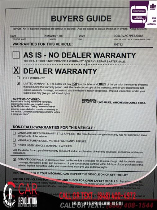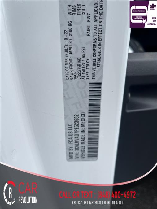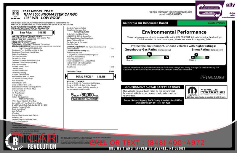 Contact Car Revolution today for information on dozens of vehicles like this 2023 Ram ProMaster 1500 Low Roof. This Ram includes: Optional Equipment: Convenience Power door mirrors Heated driver and passenger side door mirrors Cruise control with steering wheel mounted controls Comfort Seating capacity - 2 Front passenger seat with 4-way directional controls Vinyl front seat upholstery Passenger seat manual reclining and fore/aft control Exterior and Appearance Clearcoat paint Manual extendable trailer mirrors Front license plate bracket Seating Vinyl Bucket Seats Driver bucket seat Vinyl front seat upholstery Passenger Bucket Seat Seating capacity - 2 Bucket front seats Front passenger seat with 4-way directional controls Passenger seat manual reclining and fore/aft control 4-Way Manual Adjust Front Passenger Seat Front passenger seat with 4-way directional controls Passenger seat manual reclining and fore/aft control Exterior Front License Plate Bracket Front license plate bracket Wide Power Heated Mirrors Power door mirrors Heated driver and passenger side door mirrors Manual extendable trailer mirrors Manual folding door mirrors 96 Wide Exterior Mirrors Manual extendable trailer mirrors Additional Options Quick Order Package 22A Interior Manufacturer's Statement of Origin Speed Control Cruise control with steering wheel mounted controls Global Telematics Box Module Black Paint Bright White Clearcoat Clearcoat paint *Note - For third party subscriptions or services, please contact the dealer for more information.* This Ram ProMaster 1500 Low Roof is for the discerning driver who demands the utmost of his vehicle. There are many vehicles on the market but if you are looking for a vehicle that will perform as good as it looks then this Ram ProMaster 1500 Low Roof is the one! Surprising quality accompanied by a high level of performance...this Bright White Clearcoat on Black Ram ProMaster 1500 Low Roof could end up being the perfect match for you. Car Revolution has been in business since 1998 with 2 locations and over 300 cars. A family owned business, focused and determined to extend hospitality to all our clients. We make every effort to present information that is accurate. However, it is based on data provided by the vehicle manufacturer and other sources. Therefore exact Configuration, Color, Certification and Accessories should be used as a guide only and are not guaranteed under any circumstances, for any inaccuracies, claims of losses of any nature. All advertised prices includes all cost to be paid by the consumer, except: Title, Taxes, Registration, License Fees, Insurance, Dealer Prep, Additional Options and include all applicable rebates. Subject to Credit Approval. Every effort is made in order to display accurate and current vehicle information, including Pricing. All vehicles are subjected to prior sale, removal and transport elsewhere, awaiting Title and Ownership Confirmation. Inventory is updated daily and subject to change. Not responsible for typographical errors or omissions. To better insure the specific vehicle's availability, call us right away at 856-316-3444 and feel free to ask any questions. EMG-WB Car Revolution is excited to offer this 2023 Ram ProMaster Cargo Van . Pull up in the vehicle and the valet will want to parked on the front row. This Ram ProMaster Cargo Van is the vehicle others dream to own. Don't miss your chance to make it your new ride. Just what you've been looking for. With quality in mind, this vehicle is the perfect addition to take home. Driven by many, but adored by more, the Ram ProMaster Cargo Van is a perfect addition to any home. There are many vehicles on the market but if you are looking for a vehicle that will perform as good as it looks then this Ram ProMaster Cargo Van is the one! C