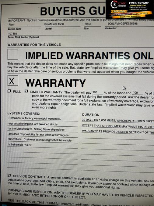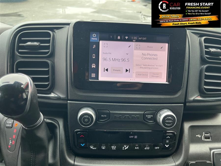 Check out this pre-owned 2023 Ram ProMaster 1500 we recently got in. This Ram includes: Optional Equipment: Safety and Security Front fog lights Convenience Power door mirrors Heated driver and passenger side door mirrors Front under seat tray Cargo net Supplemental cargo area lighting Cruise control with steering wheel mounted controls 1 interior 120V AC power outlet Fixed rear windshield Day/Night rearview mirror Ambient lighting Comfort Seating capacity - 2 Front passenger seat with 4-way directional controls Deep tinted windows Passenger seat manual reclining and fore/aft control Exterior and Appearance Non-metallic paint Full-size spare tire with steel wheel Crank-down spare tire Manual extendable trailer mirrors Front license plate bracket Seating Passenger Bucket Seat Seating capacity - 2 Bucket front seats Front passenger seat with 4-way directional controls Passenger seat manual reclining and fore/aft control Underseat Storage Tray Front under seat tray 4-Way Manual Adjust Front Passenger Seat Front passenger seat with 4-way directional controls Passenger seat manual reclining and fore/aft control Tires & Wheels Full Size Spare Tire Full-size spare tire with steel wheel Crank-down spare tire Exterior Front Fog Lamps Front fog lights Front License Plate Bracket Front license plate bracket Rear Hinged Doors with Fixed Glass Split swing-out rear cargo door Deep tinted windows Fixed rear windshield Day/Night rearview mirror Wide Power Heated Mirrors Power door mirrors Heated driver and passenger side door mirrors Driver and passenger convex spotter mirrors Manual extendable trailer mirrors Manual folding door mirrors Turn signal indicator in door mirrors Black door mirrors Deep Tint Sunscreen Glass Deep tinted windows 96 Wide Exterior Mirrors Manual extendable trailer mirrors Additional Options Convenience Group Front under seat tray Cargo net Ambient lighting Quick Order Package 22A 115V Auxiliary Power Outlet 1 interior 120V AC power outlet Interior Rear Cargo LED Lamp Supplemental cargo area lighting Speed Control Cruise control with steering wheel mounted controls Cargo Net Cargo net Shelf Above Roof Trim Rear View Day/night Mirror Day/Night rearview mirror Ambient LED Interior Lighting Ambient lighting Global Telematics Box Module Black Engine 100 Amp Battery 220 Amp Alternator Alternator Paint Bright White Clearcoat Non-metallic paint *Note - For third party subscriptions or services, please contact the dealer for more information.* Sophistication & understated luxury comes standard on this Ram ProMaster 1500 Low Roof. Well-known by many, the ProMaster 1500 has become a household name in the realm of quality and prestige. One of the best things about this Ram ProMaster 1500 is that it has low, low mileage. It's ready for you to truly break it in. A truly breathtaking example of pure vehicle design achievement...this is the vehicle of your dreams! Car Revolution has been in business since 1998 with 2 locations and over 300 cars. A family owned business, focused and determined to extend hospitality to all our clients. We make every effort to present information that is accurate. However, it is based on data provided by the vehicle manufacturer and other sources. Therefore exact Configuration, Color, Certification and Accessories should be used as a guide only and are not guaranteed under any circumstances, for any inaccuracies, claims of losses of any nature. All advertised prices includes all cost to be paid by the consumer, except: Title, Taxes, Registration, License Fees, Insurance, Dealer Prep, Additional Options and include all applicable rebates. Subject to Credit Approval. Every effort is made in order to display accurate and current vehicle information, including Pricing. All vehicles are subjected to prior sale, removal and transport elsewhere, awaiting Title and Ownership Confirmation. Inventory is updated daily and subject to change. Not responsible for typographical errors or omissions. To better insure the specific vehicle's availability, call us right away at 856-316-3444 and feel free to ask any questions. EMG-WB Thank you for your interest in one of Car Revolution's online offerings. Please continue for more information regarding this 2023 Ram ProMaster Cargo Van with 31,611mi. Is it possible to fall in love with a vehicle? It is when your vehicle is as prestige as the Ram ProMaster Cargo Van. With less than 31,611mi on this Ram ProMaster Cargo Van, you'll appreciate the practically showroom newness of this vehicle. The quintessential Ram -- This Ram ProMaster Cargo Van speaks volumes about its owner, about uncompromising individuality, a passion for driving and standards far above the ordinary. Based on the superb condition of this vehicle, along with the options and color, this Ram ProMaster Cargo Van is sure to sell fast. Car Revolution has been in business since 1998 with 2 locations and over 300 cars. A family owned business, focused and determined to extend hospitality to all our clients. We make every effort to present information that is accurate. However, it is based on data provided by the vehicle manufacturer and other sources. Therefore exact Configuration, Color, Certification and Accessories should be used as a guide only and are not guaranteed under any circumstances, for any inaccuracies, claims of losses of any nature. All advertised prices includes all cost to be paid by the consumer, except: Title, Taxes, Registration, License Fees, Insurance, Dealer Prep, Additional Options and include all applicable rebates. Subject to Credit Approval. Every effort is made in order to display accurate and current vehicle information, including Pricing. All vehicles are subjected to prior sale, removal and transport elsewhere, awaiting Title and Ownership Confirmation. Inventory is updated daily and subject to change. Not responsible for typographical errors or omissions. To better insure the specific vehicle's availability, call us right away at 856-316-3444 