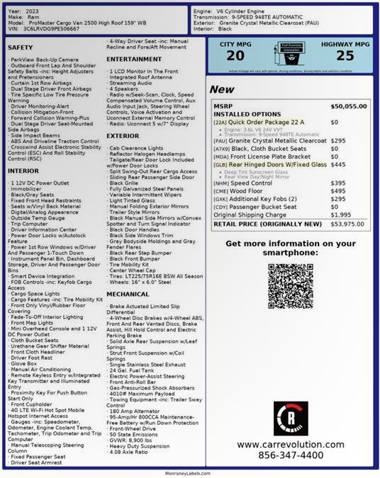 Looking for a clean, well-cared for 2023 Ram ProMaster 2500? This is it. This Ram includes: Optional Equipment: Convenience Wood cargo area floor Cruise control with steering wheel mounted controls Fixed rear windshield Day/Night rearview mirror Comfort Seating capacity - 2 Front passenger seat with 4-way directional controls Deep tinted windows Passenger seat manual reclining and fore/aft control Exterior and Appearance Metallic paint Front license plate bracket Seating Passenger Bucket Seat Seating capacity - 2 Bucket front seats Front passenger seat with 4-way directional controls Passenger seat manual reclining and fore/aft control 4-Way Manual Adjust Front Passenger Seat Front passenger seat with 4-way directional controls Passenger seat manual reclining and fore/aft control Exterior Front License Plate Bracket Front license plate bracket Rear Hinged Doors with Fixed Glass Split swing-out rear cargo door Deep tinted windows Fixed rear windshield Day/Night rearview mirror Deep Tint Sunscreen Glass Deep tinted windows Additional Options Quick Order Package 22A Interior Additional Key Fobs (2) Speed Control Cruise control with steering wheel mounted controls Wood Floor Wood cargo area floor Rear View Day/night Mirror Day/Night rearview mirror Global Telematics Box Module Black Paint Granite Crystal Met CC Metallic paint *Note - For third party subscriptions or services, please contact the dealer for more information.* Is it possible to fall in love with a vehicle? It is when your vehicle is as prestige as the Ram ProMaster 2500. Beautiful color combination with Granite Crystal Metallic Clearcoat exterior over Black interior making this the one to own! This is about the time when you're saying it is too good to be true, and let us be the one's to tell you, it is absolutely true. Car Revolution has been in business since 1998 with 2 locations and over 300 cars. A family owned business, focused and determined to extend hospitality to all our clients. We make every effort to present information that is accurate. However, it is based on data provided by the vehicle manufacturer and other sources. Therefore exact Configuration, Color, Certification and Accessories should be used as a guide only and are not guaranteed under any circumstances, for any inaccuracies, claims of losses of any nature. All advertised prices includes all cost to be paid by the consumer, except: Title, Taxes, Registration, License Fees, Insurance, Dealer Prep, Additional Options and include all applicable rebates. Subject to Credit Approval. Every effort is made in order to display accurate and current vehicle information, including Pricing. All vehicles are subjected to prior sale, removal and transport elsewhere, awaiting Title and Ownership Confirmation. Inventory is updated daily and subject to change. Not responsible for typographical errors or omissions. To better insure the specific vehicle's availability, call us right away at 856-316-3444 and feel free to ask any questions. EMG-WB Car Revolution is pleased to be currently offering this 2023 Ram ProMaster Cargo Van with 71,613mi. There's a level of quality and refinement in this Ram ProMaster Cargo Van that you won't find in your average vehicle. This is about the time when you're saying it is too good to be true, and let us be the one's to tell you, it is absolutely true. Driven by many, but adored by more, the Ram ProMaster Cargo Van is a perfect addition to any home. There are many vehicles on the market but if you are looking for a vehicle that will perform as good as it looks then this Ram ProMaster Cargo Van is the one! Car Revolution has been in business since 1998 with 2 locations and over 300 cars. A family owned business, focused and determined to extend hospitality to all our clients. We make every effort to present information that is accurate. However, it is based on data provided by the vehicle manufacturer and other sources. Therefore exact Configuration, Color, Certification and Accessories should be used as a guide only and are not guaranteed under any circumstances, for any inaccuracies, claims of losses of any nature. All advertised prices includes all cost to be paid by the consumer, except: Title, Taxes, Registration, License Fees, Insurance, Dealer Prep, Additional Options and include all applicable rebates. Subject to Credit Approval. Every effort is made in order to display accurate and current vehicle information, including Pricing. All vehicles are subjected to prior sale, removal and transport elsewhere, awaiting Title and Ownership Confirmation. Inventory is updated daily and subject to change. Not responsible for typographical errors or omissions. To better insure the specific vehicle's availability, call us right away at 856-316-3444 and feel free to ask any questions. EMG-WB