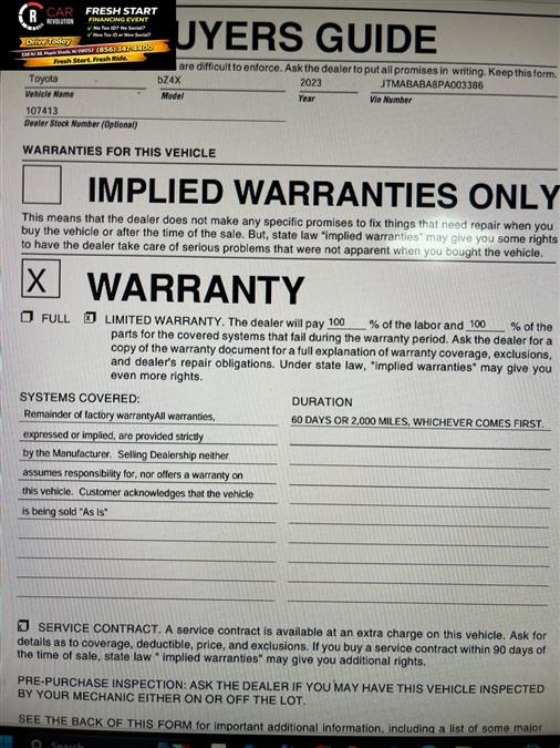 Contact Car Revolution today for information on dozens of vehicles like this 2023 Toyota bZ4X XLE. This Toyota includes: Optional Equipment: Interior Carpet Floor Mats/Cargo Mat Carpet front and rear floor mats Carpet cargo mat Black Convenience Carpet cargo mat Comfort Carpet front and rear floor mats Exterior and Appearance Non-metallic paint Paint Black Non-metallic paint Emissions 50 STATE EMISSIONS ZEV emissions Tier 3 Bin 0 emissions *Note - For third party subscriptions or services, please contact the dealer for more information.* With this exceptional SUV, you'll get sport, utility, and comfort. Sophistication & understated luxury comes standard on this Toyota bZ4X XLE. Well-known by many, the bZ4X has become a household name in the realm of quality and prestige. This Toyota bZ4X features AWD. That means power and control delivered to all four wheels for maximum grip and improved handling. In addition to being well-cared for, this Toyota bZ4X has very low mileage making it a rare find. This Toyota bZ4X offers the most up-to-date navigation system available so you'll always know the most efficient route to where you are going. Car Revolution has been in business since 1998 with 2 locations and over 300 cars. A family owned business, focused and determined to extend hospitality to all our clients. We make every effort to present information that is accurate. However, it is based on data provided by the vehicle manufacturer and other sources. Therefore exact Configuration, Color, Certification and Accessories should be used as a guide only and are not guaranteed under any circumstances, for any inaccuracies, claims of losses of any nature. All advertised prices includes all cost to be paid by the consumer, except: Title, Taxes, Registration, License Fees, Insurance, Dealer Prep, Additional Options and include all applicable rebates. Subject to Credit Approval. Every effort is made in order to display accurate and current vehicle information, including Pricing. All vehicles are subjected to prior sale, removal and transport elsewhere, awaiting Title and Ownership Confirmation. Inventory is updated daily and subject to change. Not responsible for typographical errors or omissions. To better insure the specific vehicle's availability, call us right away at 856-316-3444 and feel free to ask any questions. EMG-WB You can find this 2023 Toyota bZ4X XLE and many others like it at Car Revolution. Treat yourself to an SUV that surrounds you with all the comfort and conveniences of a luxury sedan. Indulge yourself with one of the most highly crafted, most luxurious automobiles available today. Comfort. Performance. Safety. Enjoy all three with this well-appointed AWD 2023 Toyota. One of the best things about this Toyota bZ4X is that it has low, low mileage. It's ready for you to truly break it in. Car Revolution has been in business since 1998 with 2 locations and over 300 cars. A family owned business, focused and determined to extend hospitality to all our clients. We make every effort to present information that is accurate. However, it is based on data provided by the vehicle manufacturer and other sources. Therefore exact Configuration, Color, Certification and Accessories should be used as a guide only and are not guaranteed under any circumstances, for any inaccuracies, claims of losses of any nature. All advertised prices includes all cost to be paid by the consumer, except: Title, Taxes, Registration, License Fees, Insurance, Dealer Prep, Additional Options and include all applicable rebates. Subject to Credit Approval. Every effort is made in order to display accurate and current vehicle information, including Pricing. All vehicles are subjected to prior sale, removal and transport elsewhere, awaiting Title and Ownership Confirmation. Inventory is updated daily and subject to change. Not responsible for typographical errors or omissions. To better insure the specific vehicle's availability, call us right away at 856-316-3444 and feel free to ask any questions. EMG-WB