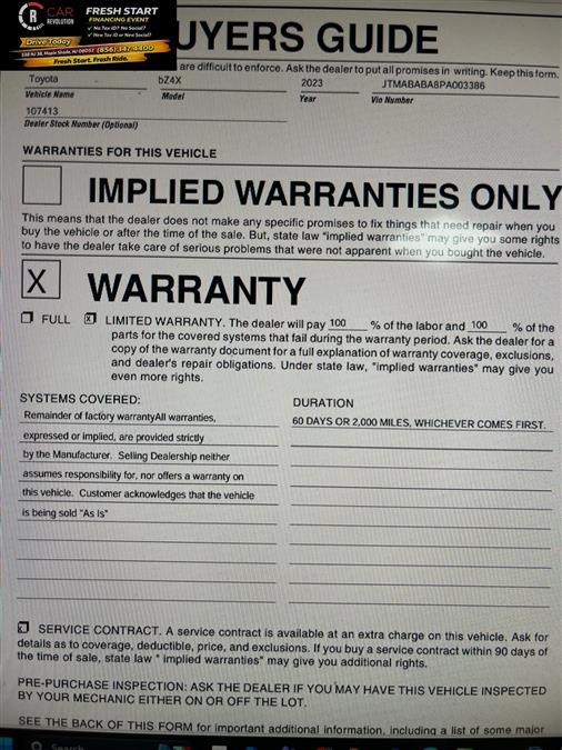 Contact Car Revolution today for information on dozens of vehicles like this 2023 Toyota bZ4X XLE. This Toyota includes: Optional Equipment: Interior Carpet Floor Mats/Cargo Mat Carpet front and rear floor mats Carpet cargo mat Black Convenience Carpet cargo mat Comfort Carpet front and rear floor mats Exterior and Appearance Non-metallic paint Paint Black Non-metallic paint Emissions 50 STATE EMISSIONS ZEV emissions Tier 3 Bin 0 emissions *Note - For third party subscriptions or services, please contact the dealer for more information.* With this exceptional SUV, you'll get sport, utility, and comfort. Sophistication & understated luxury comes standard on this Toyota bZ4X XLE. Well-known by many, the bZ4X has become a household name in the realm of quality and prestige. This Toyota bZ4X features AWD. That means power and control delivered to all four wheels for maximum grip and improved handling. In addition to being well-cared for, this Toyota bZ4X has very low mileage making it a rare find. This Toyota bZ4X offers the most up-to-date navigation system available so you'll always know the most efficient route to where you are going. Car Revolution has been in business since 1998 with 2 locations and over 300 cars. A family owned business, focused and determined to extend hospitality to all our clients. We make every effort to present information that is accurate. However, it is based on data provided by the vehicle manufacturer and other sources. Therefore exact Configuration, Color, Certification and Accessories should be used as a guide only and are not guaranteed under any circumstances, for any inaccuracies, claims of losses of any nature. All advertised prices includes all cost to be paid by the consumer, except: Title, Taxes, Registration, License Fees, Insurance, Dealer Prep, Additional Options and include all applicable rebates. Subject to Credit Approval. Every effort is made in order to display accurate and current vehicle information, including Pricing. All vehicles are subjected to prior sale, removal and transport elsewhere, awaiting Title and Ownership Confirmation. Inventory is updated daily and subject to change. Not responsible for typographical errors or omissions. To better insure the specific vehicle's availability, call us right away at 856-316-3444 and feel free to ask any questions. EMG-WB You can find this 2023 Toyota bZ4X XLE and many others like it at Car Revolution. Treat yourself to an SUV that surrounds you with all the comfort and conveniences of a luxury sedan. Indulge yourself with one of the most highly crafted, most luxurious automobiles available today. Comfort. Performance. Safety. Enjoy all three with this well-appointed AWD 2023 Toyota. One of the best things about this Toyota bZ4X is that it has low, low mileage. It's ready for you to truly break it in. Car Revolution has been in business since 1998 with 2 locations and over 300 cars. A family owned business, focused and determined to extend hospitality to all our clients. We make every effort to present information that is accurate. However, it is based on data provided by the vehicle manufacturer and other sources. Therefore exact Configuration, Color, Certification and Accessories should be used as a guide only and are not guaranteed under any circumstances, for any inaccuracies, claims of losses of any nature. All advertised prices includes all cost to be paid by the consumer, except: Title, Taxes, Registration, License Fees, Insurance, Dealer Prep, Additional Options and include all applicable rebates. Subject to Credit Approval. Every effort is made in order to display accurate and current vehicle information, including Pricing. All vehicles are subjected to prior sale, removal and transport elsewhere, awaiting Title and Ownership Confirmation. Inventory is updated daily and subject to change. Not responsible for typographical errors or omissions. To better insure the specific vehicle's availability, call us right away at 856-316-3444 and feel free to ask any questions. EMG-WB