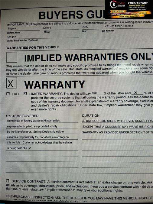 This outstanding example of a 2023 Toyota Camry XSE is offered by Car Revolution. This Toyota includes: Optional Equipment: Interior Black Exterior and Appearance Metallic paint Paint Midnight Black Metallic Metallic paint Emissions 50 State Emissions LEV3-SULEV30 emissions Tier 3 Bin 30 emissions *Note - For third party subscriptions or services, please contact the dealer for more information.* The less money you spend at the pump, the more money you'll have to spend on you. So why not consider this wonderfully styled, fuel-efficient Toyota Camry. There are many vehicles on the market but if you are looking for a vehicle that will perform as good as it looks then this Toyota Camry XSE is the one! This is the one. Just what you've been looking for. Car Revolution has been in business since 1998 with 2 locations and over 300 cars. A family owned business, focused and determined to extend hospitality to all our clients. We make every effort to present information that is accurate. However, it is based on data provided by the vehicle manufacturer and other sources. Therefore exact Configuration, Color, Certification and Accessories should be used as a guide only and are not guaranteed under any circumstances, for any inaccuracies, claims of losses of any nature. All advertised prices includes all cost to be paid by the consumer, except: Title, Taxes, Registration, License Fees, Insurance, Dealer Prep, Additional Options and include all applicable rebates. Subject to Credit Approval. Every effort is made in order to display accurate and current vehicle information, including Pricing. All vehicles are subjected to prior sale, removal and transport elsewhere, awaiting Title and Ownership Confirmation. Inventory is updated daily and subject to change. Not responsible for typographical errors or omissions. To better insure the specific vehicle's availability, call us right away at 856-316-3444 and feel free to ask any questions. EMG-WB This 2023 Toyota Camry XSE is proudly offered by Car Revolution Start enjoying more time in your new ride and less time at the gas station with this 2023 Toyota Camry. Driven by many, but adored by more, the Toyota Camry XSE is a perfect addition to any home. There is no reason why you shouldn't buy this Toyota Camry XSE. It is incomparable for the price and quality. Just what you've been looking for. With quality in mind, this vehicle is the perfect addition to take home. Car Revolution has been in business since 1998 with 2 locations and over 300 cars. A family owned business, focused and determined to extend hospitality to all our clients. We make every effort to present information that is accurate. However, it is based on data provided by the vehicle manufacturer and other sources. Therefore exact Configuration, Color, Certification and Accessories should be used as a guide only and are not guaranteed under any circumstances, for any inaccuracies, claims of losses of any nature. All advertised prices includes all cost to be paid by the consumer, except: Title, Taxes, Registration, License Fees, Insurance, Dealer Prep, Additional Options and include all applicable rebates. Subject to Credit Approval. Every effort is made in order to display accurate and current vehicle information, including Pricing. All vehicles are subjected to prior sale, removal and transport elsewhere, awaiting Title and Ownership Confirmation. Inventory is updated daily and subject to change. Not responsible for typographical errors or omissions. To better insure the specific vehicle's availability, call us right away at 856-316-3444 and feel free to ask any questions. EMG-WB