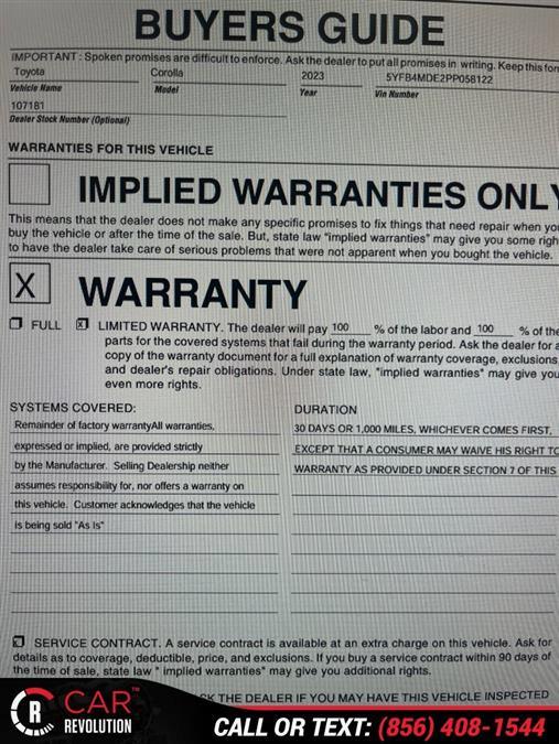 Car Revolution is honored to present a wonderful example of pure vehicle design... this 2023 Toyota Corolla LE only has 50,115mi on it and could potentially be the vehicle of your dreams! This Toyota includes: Optional Equipment: Interior Black Exterior and Appearance Metallic paint Paint Blueprint Metallic paint Emissions 50 State Emissions LEV3-SULEV30 emissions Tier 3 Bin 30 emissions *Note - For third party subscriptions or services, please contact the dealer for more information.* The greater your fuel-efficiency, the less your carbon footprint. And with exceptional MPGs, this Toyota Corolla treads ever so lightly on Mother Earth. Based on the superb condition of this vehicle, along with the options and color, this Toyota Corolla LE is sure to sell fast. A truly breathtaking example of pure vehicle design achievement...this is the vehicle of your dreams! Car Revolution has been in business since 1998 with 2 locations and over 300 cars. A family owned business, focused and determined to extend hospitality to all our clients. We make every effort to present information that is accurate. However, it is based on data provided by the vehicle manufacturer and other sources. Therefore exact Configuration, Color, Certification and Accessories should be used as a guide only and are not guaranteed under any circumstances, for any inaccuracies, claims of losses of any nature. All advertised prices includes all cost to be paid by the consumer, except: Title, Taxes, Registration, License Fees, Insurance, Dealer Prep, Additional Options and include all applicable rebates. Subject to Credit Approval. Every effort is made in order to display accurate and current vehicle information, including Pricing. All vehicles are subjected to prior sale, removal and transport elsewhere, awaiting Title and Ownership Confirmation. Inventory is updated daily and subject to change. Not responsible for typographical errors or omissions. To better insure the specific vehicle's availability, call us right away at 856-316-3444 and feel free to ask any questions. EMG-WB Thank you for your interest in one of Car Revolution's online offerings. Please continue for more information regarding this 2023 Toyota Corolla LE with 50,115mi. Outstanding fuel economy and sleek styling are two great reasons to consider this Toyota Corolla. Driven by many, but adored by more, the Toyota Corolla LE is a perfect addition to any home. You could keep looking, but why? You've found the perfect vehicle right here. Look no further, you have found exactly what you've been looking for. Car Revolution has been in business since 1998 with 2 locations and over 300 cars. A family owned business, focused and determined to extend hospitality to all our clients. We make every effort to present information that is accurate. However, it is based on data provided by the vehicle manufacturer and other sources. Therefore exact Configuration, Color, Certification and Accessories should be used as a guide only and are not guaranteed under any circumstances, for any inaccuracies, claims of losses of any nature. All advertised prices includes all cost to be paid by the consumer, except: Title, Taxes, Registration, License Fees, Insurance, Dealer Prep, Additional Options and include all applicable rebates. Subject to Credit Approval. Every effort is made in order to display accurate and current vehicle information, including Pricing. All vehicles are subjected to prior sale, removal and transport elsewhere, awaiting Title and Ownership Confirmation. Inventory is updated daily and subject to change. Not responsible for typographical errors or omissions. To better insure the specific vehicle's availability, call us right away at 856-316-3444 and feel free to ask any questions. EMG-WB