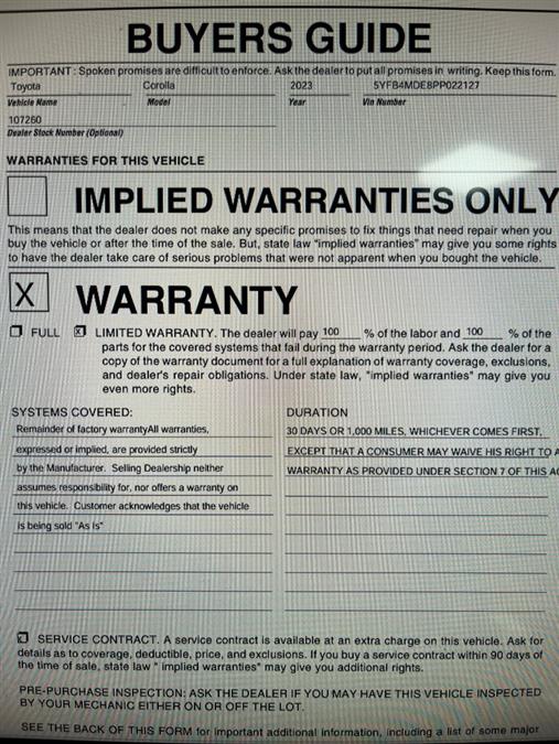 This 2023 Toyota Corolla LE is proudly offered by Car Revolution This Toyota includes: Optional Equipment: Interior Black Exterior and Appearance Metallic paint Paint Midnight Black Metallic Metallic paint Emissions 50 State Emissions LEV3-SULEV30 emissions Tier 3 Bin 30 emissions *Note - For third party subscriptions or services, please contact the dealer for more information.* Save money at the pump with this fuel-sipping Toyota Corolla. This Midnight Black Metallic Toyota is clean and shiny exterior makes it look like it came straight from the factory. Look no further, you have found exactly what you've been looking for. Car Revolution has been in business since 1998 with 2 locations and over 300 cars. A family owned business, focused and determined to extend hospitality to all our clients. We make every effort to present information that is accurate. However, it is based on data provided by the vehicle manufacturer and other sources. Therefore exact Configuration, Color, Certification and Accessories should be used as a guide only and are not guaranteed under any circumstances, for any inaccuracies, claims of losses of any nature. All advertised prices includes all cost to be paid by the consumer, except: Title, Taxes, Registration, License Fees, Insurance, Dealer Prep, Additional Options and include all applicable rebates. Subject to Credit Approval. Every effort is made in order to display accurate and current vehicle information, including Pricing. All vehicles are subjected to prior sale, removal and transport elsewhere, awaiting Title and Ownership Confirmation. Inventory is updated daily and subject to change. Not responsible for typographical errors or omissions. To better insure the specific vehicle's availability, call us right away at 856-316-3444 and feel free to ask any questions. EMG-WB Car Revolution is excited to offer this 2023 Toyota Corolla LE. Stylish and fuel efficient. It's the perfect vehicle for keeping your fuel costs down and your driving enjoying up. This is about the time when you're saying it is too good to be true, and let us be the one's to tell you, it is absolutely true. Driven by many, but adored by more, the Toyota Corolla LE is a perfect addition to any home. You can finally stop searching... You've found the one you've been looking for. Car Revolution has been in business since 1998 with 2 locations and over 300 cars. A family owned business, focused and determined to extend hospitality to all our clients. We make every effort to present information that is accurate. However, it is based on data provided by the vehicle manufacturer and other sources. Therefore exact Configuration, Color, Certification and Accessories should be used as a guide only and are not guaranteed under any circumstances, for any inaccuracies, claims of losses of any nature. All advertised prices includes all cost to be paid by the consumer, except: Title, Taxes, Registration, License Fees, Insurance, Dealer Prep, Additional Options and include all applicable rebates. Subject to Credit Approval. Every effort is made in order to display accurate and current vehicle information, including Pricing. All vehicles are subjected to prior sale, removal and transport elsewhere, awaiting Title and Ownership Confirmation. Inventory is updated daily and subject to change. Not responsible for typographical errors or omissions. To better insure the specific vehicle's availability, call us right away at 856-316-3444 and feel free to ask any questions. EMG-WB