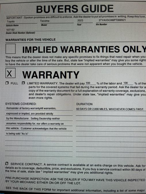 This 2023 Toyota Tacoma SR5 DOUBLE CAB 2WD is offered to you for sale by Car Revolution. This Toyota includes: Optional Equipment: Paint Celestial Silver Metallic Metallic paint Interior Cement Emissions 50 State Emissions LEV3-ULEV70 emissions Tier 3 Bin 70 emissions Exterior and Appearance Metallic paint Additional Options SR5 Package: All Content Included as Standard Equipment Chrome rear bumper Black grille with chrome surround Daytime running lights Keyfob keyless entry Auto-locking doors Front fog lights Remote panic alarm *Note - For third party subscriptions or services, please contact the dealer for more information.* Beautiful color combination with Celestial Silver Metallic exterior over Cement interior making this the one to own! This is the one. Just what you've been looking for. Just what you've been looking for. With quality in mind, this vehicle is the perfect addition to take home. Car Revolution has been in business since 1998 with 2 locations and over 300 cars. A family owned business, focused and determined to extend hospitality to all our clients. We make every effort to present information that is accurate. However, it is based on data provided by the vehicle manufacturer and other sources. Therefore exact Configuration, Color, Certification and Accessories should be used as a guide only and are not guaranteed under any circumstances, for any inaccuracies, claims of losses of any nature. All advertised prices includes all cost to be paid by the consumer, except: Title, Taxes, Registration, License Fees, Insurance, Dealer Prep, Additional Options and include all applicable rebates. Subject to Credit Approval. Every effort is made in order to display accurate and current vehicle information, including Pricing. All vehicles are subjected to prior sale, removal and transport elsewhere, awaiting Title and Ownership Confirmation. Inventory is updated daily and subject to change. Not responsible for typographical errors or omissions. To better insure the specific vehicle's availability, call us right away at 856-316-3444 and feel free to ask any questions. EMG-WB Thank you for your interest in one of Car Revolution's online offerings. Please continue for more information regarding this 2023 Toyota Tacoma 2WD SR5 with 48,207mi. Driven by many, but adored by more, the Toyota Tacoma 2WD SR5 is a perfect addition to any home. This is about the time when you're saying it is too good to be true, and let us be the one's to tell you, it is absolutely true. You can finally stop searching... You've found the one you've been looking for. There are many vehicles on the market but if you are looking for a vehicle that will perform as good as it looks then this Toyota Tacoma 2WD SR5 is the one! Car Revolution has been in business since 1998 with 2 locations and over 300 cars. A family owned business, focused and determined to extend hospitality to all our clients. We make every effort to present information that is accurate. However, it is based on data provided by the vehicle manufacturer and other sources. Therefore exact Configuration, Color, Certification and Accessories should be used as a guide only and are not guaranteed under any circumstances, for any inaccuracies, claims of losses of any nature. All advertised prices includes all cost to be paid by the consumer, except: Title, Taxes, Registration, License Fees, Insurance, Dealer Prep, Additional Options and include all applicable rebates. Subject to Credit Approval. Every effort is made in order to display accurate and current vehicle information, including Pricing. All vehicles are subjected to prior sale, removal and transport elsewhere, awaiting Title and Ownership Confirmation. Inventory is updated daily and subject to change. Not responsible for typographical errors or omissions. To better insure the specific vehicle's availability, call us right away at 856-316-3444 and feel free to ask any questions. EMG-WB
