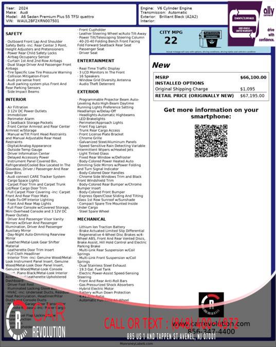 You can find this 2024 Audi A6 Sedan Premium Plus and many others like it at CAR REVOLUTION. You deserve a vehicle designed for higher expectations. This Audi A6 Sedan Premium Plus delivers with a luxurious, well-appointed interior and world-class engineering. This Audi A6 Sedan Premium Plus is equipped with AWD for improved handling. Whether you're faced with inclement weather or just out enjoying the twisting back road, you'll have the grip of AWD on your side. Driven by many, but adored by more, the Audi A6 Sedan Premium Plus is a perfect addition to any home. You could keep looking, but why? You've found the perfect vehicle right here. Car Revolution has been in business since 1998 with 2 locations and over 300 cars. A family owned business, focused and determined to extend hospitality to all our clients. We make every effort to present information that is accurate. However, it is based on data provided by the vehicle manufacturer and other sources. Therefore exact Configuration, Color, Certification and Accessories should be used as a guide only and are not guaranteed under any circumstances, for any inaccuracies, claims of losses of any nature. All advertised prices includes all cost to be paid by the consumer, except: Title, Taxes, Registration, License Fees, Insurance, Dealer Prep, Additional Options and include all applicable rebates. Subject to Credit Approval. Every effort is made in order to display accurate and current vehicle information, including Pricing. All vehicles are subjected to prior sale, removal and transport elsewhere, awaiting Title and Ownership Confirmation. Inventory is updated daily and subject to change. Not responsible for typographical errors or omissions. To better insure the specific vehicle's availability, call us right away at 732-527-0477 and feel free to ask any questions. EMG-WB