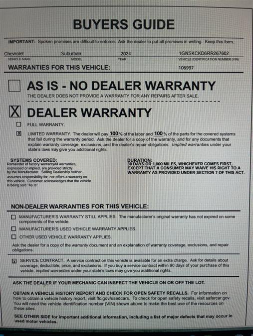 Car Revolution is excited to offer this 2024 Chevrolet Suburban LT 4WD. This Chevrolet includes: Optional Equipment: Exterior and Appearance Metallic paint Additional Options Preferred Equipment Group 1LT Driver seat with 8-way directional controls Driver seat with 2-way power lumbar Front passenger seat with 8-way directional controls Front passenger seat with 2-way power lumbar Driver seat power reclining, lumbar support, cushion tilt, fore/aft control and height adjustable control Passenger seat power reclining, lumbar support, cushion tilt, fore/aft control and height adjustable control Interior Deleted 3 Years of Remote Access Keyfob remote start Smart device remote start Jet Black Paint Sterling Gray Metallic Metallic paint Emissions CT/DE/ME/MD/MA/NJ/NY/OR/PA/RI/VT/WA Emissions Requirements LEV3-ULEV50 emissions Tier 3 Bin 50 emissions Federal Emissions Override LEV3-ULEV50 emissions Tier 3 Bin 50 emissions *Note - For third party subscriptions or services, please contact the dealer for more information.* This Chevrolet Suburban offers all the comforts of a well-optioned sedan with the utility you demand from an SUV. The Chevrolet Suburban LT 4WD's pristine good looks were combined with the Chevrolet high standard of excellence in order to make this a unique find. Want to brave the road less traveled? You'll have the 4WD capabilities to do it with this vehicle. Added comfort with contemporary style is the leather interior to heighten the quality and craftsmanship for the Chevrolet Suburban LT 4WD. Car Revolution has been in business since 1998 with 2 locations and over 300 cars. A family owned business, focused and determined to extend hospitality to all our clients. We make every effort to present information that is accurate. However, it is based on data provided by the vehicle manufacturer and other sources. Therefore exact Configuration, Color, Certification and Accessories should be used as a guide only and are not guaranteed under any circumstances, for any inaccuracies, claims of losses of any nature. All advertised prices includes all cost to be paid by the consumer, except: Title, Taxes, Registration, License Fees, Insurance, Dealer Prep, Additional Options and include all applicable rebates. Subject to Credit Approval. Every effort is made in order to display accurate and current vehicle information, including Pricing. All vehicles are subjected to prior sale, removal and transport elsewhere, awaiting Title and Ownership Confirmation. Inventory is updated daily and subject to change. Not responsible for typographical errors or omissions. To better insure the specific vehicle's availability, call us right away at 856-316-3444 and feel free to ask any questions. EMG-WB Car Revolution is honored to present a wonderful example of pure vehicle design... this 2024 Chevrolet Suburban LT only has 57,947mi on it and could potentially be the vehicle of your dreams! Perfect for the on-the-go family, this Chevrolet Suburban LT is an SUV everyone will love. With exceptional mileage, options and power, you'll insist on driving it on all your outings. You deserve a vehicle designed for higher expectations. This Chevrolet Suburban LT delivers with a luxurious, well-appointed interior and world-class engineering. When Chevrolet created this vehicle with 4 wheel drive, they immediately enhanced the performance ability. Easily switch between two and four wheel drive to take advantage of the improved traction. There are many vehicles on the market but if you are looking for a vehicle that will perform as good as it looks then this Chevrolet Suburban LT is the one! Car Revolution has been in business since 1998 with 2 locations and over 300 cars. A family owned business, focused and determined to extend hospitality to all our clients. We make every effort to present information that is accurate. However, it is based on data provided by the vehicle manufacturer and other sources. Therefore exact Configuration, Color, Certification and Accessories should be used as a guide only and are not guaranteed under any circumstances, for any inaccuracies, claims of losses of any nature. All advertised prices includes all cost to be paid by the consumer, except: Title, Taxes, Registration, License Fees, Insurance, Dealer Prep, Additional Options and include all applicable rebates. Subject to Credit Approval. Every effort is made in order to display accurate and current vehicle information, including Pricing. All vehicles are subjected to prior sale, removal and transport elsewhere, awaiting Title and Ownership Confirmation. Inventory is updated daily and subject to change. Not responsible for typographical errors or omissions. To better insure the specific vehicle's availability, call us right away at 856-316-3444 and feel free to ask any questions. EMG-WB