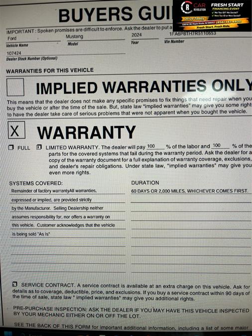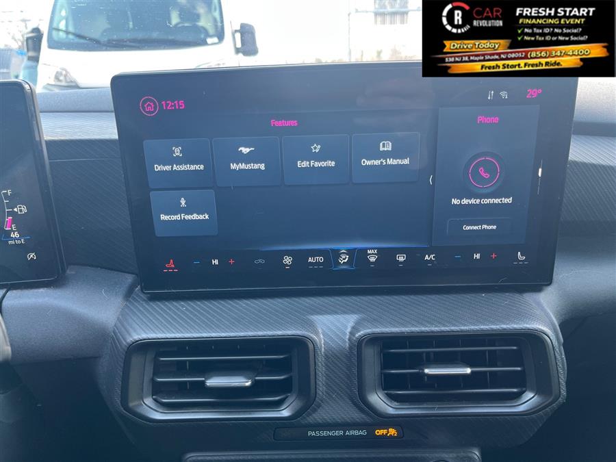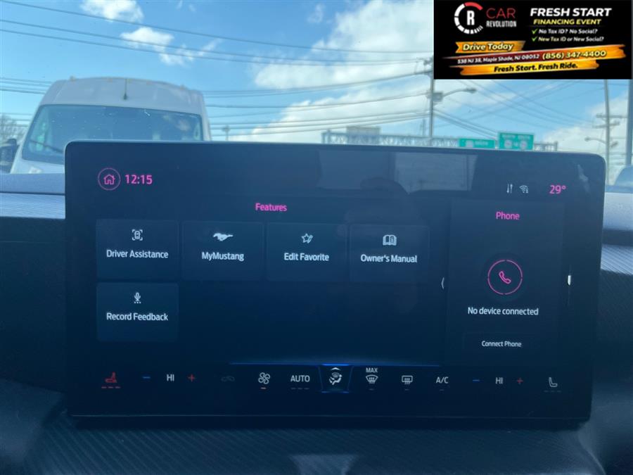 You can find this 2024 Ford Mustang EcoBoost and many others like it at Car Revolution. This Ford includes: Optional Equipment: Comfort Heated driver and front passenger seats Driver seat with 8-way directional controls Driver seat with 2-way power lumbar Front passenger seat with 6-way directional controls Cloth and vinyl front seat upholstery Cloth and vinyl rear seat upholstery Dual-zone front climate control Driver seat power lumbar support, cushion tilt, fore/aft control and height adjustable control Passenger seat power fore/aft control and height adjustable control Exterior and Appearance Non-metallic paint Seating Cloth/vinyl Heated Bucket Seats Bucket front seats Heated driver and front passenger seats Driver seat with 8-way directional controls Driver seat with 2-way power lumbar Front passenger seat with 6-way directional controls Cloth and vinyl front seat upholstery Cloth and vinyl rear seat upholstery Driver seat power lumbar support, cushion tilt, fore/aft control and height adjustable control Passenger seat power fore/aft control and height adjustable control Exterior SPOILER DELETE Additional Options Equipment Group 101A High Package Automatic climate control Air conditioning - Yes Dual-zone front climate control 3 month satellite trial subscription Amplifier Digital signal processor 9 speakers AM/FM/digital/SiriusXMsatellite In-car Entertainment 3 month satellite trial subscription Amplifier Digital signal processor 9 speakers AM/FM/digital/SiriusXMsatellite Interior BLACK ONYX CLOTH/VINYL TRIM Dual-Zone Electronic Automatic Temperature Control Automatic climate control Air conditioning - Yes Dual-zone front climate control Entertainment SiriusXM with 360L and HD Radio 3 month satellite trial subscription AM/FM/digital/SiriusXMsatellite 9-Speaker Stereo System Amplifier Digital signal processor 9 speakers Paint SHADOW BLACK Non-metallic paint *Note - For third party subscriptions or services, please contact the dealer for more information.* The Ford Mustang EcoBoost speaks volumes about it's driver, uncompromising individuality, passion for driving, and standards far above the ordinary. It's exceptional fuel-efficiency is a clear sign that not all vehicles are created with the same standards. In addition to being well-cared for, this Ford Mustang has very low mileage making it a rare find. This is the one. Just what you've been looking for. Car Revolution has been in business since 1998 with 2 locations and over 300 cars. A family owned business, focused and determined to extend hospitality to all our clients. We make every effort to present information that is accurate. However, it is based on data provided by the vehicle manufacturer and other sources. Therefore exact Configuration, Color, Certification and Accessories should be used as a guide only and are not guaranteed under any circumstances, for any inaccuracies, claims of losses of any nature. All advertised prices includes all cost to be paid by the consumer, except: Title, Taxes, Registration, License Fees, Insurance, Dealer Prep, Additional Options and include all applicable rebates. Subject to Credit Approval. Every effort is made in order to display accurate and current vehicle information, including Pricing. All vehicles are subjected to prior sale, removal and transport elsewhere, awaiting Title and Ownership Confirmation. Inventory is updated daily and subject to change. Not responsible for typographical errors or omissions. To better insure the specific vehicle's availability, call us right away at 856-316-3444 and feel free to ask any questions. EMG-WB Looking for a clean, well-cared for 2024 Ford Mustang? This is it. Outstanding fuel economy and sleek styling are two great reasons to consider this Ford Mustang. Exceptional in every sense of the word, this incredibly low mileage vehicle is one of a kind. Look no further, you have found exactly what you've been looking for. You could keep looking, but why? You've found the perfect vehicle right here. Car Revolution has been in business since 1998 with 2 locations and over 300 cars. A family owned business, focused and determined to extend hospitality to all our clients. We make every effort to present information that is accurate. However, it is based on data provided by the vehicle manufacturer and other sources. Therefore exact Configuration, Color, Certification and Accessories should be used as a guide only and are not guaranteed under any circumstances, for any inaccuracies, claims of losses of any nature. All advertised prices includes all cost to be paid by the consumer, except: Title, Taxes, Registration, License Fees, Insurance, Dealer Prep, Additional Options and include all applicable rebates. Subject to Credit Approval. Every effort is made in order to display accurate and current vehicle information, including Pricing. All vehicles are subjected to prior sale, removal and transport elsewhere, awaiting Title and Ownership Confirmation. Inventory is updated daily and subject to change. Not responsible for typographical errors or omissions. To better insure the specific vehicle's availability, call us right away at 856-316-3444 and feel free to ask any questions. EMG-WB