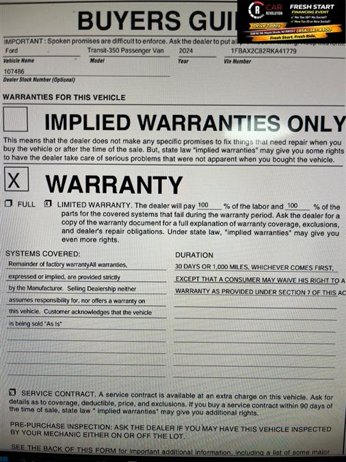 Car Revolution has a wide selection of exceptional pre-owned vehicles to choose from, including this 2024 Ford Transit Passenger Wagon. Opulent refinements married with exceptional engineering make this the kind of car you'll want to own for a lifetime. There is no reason why you shouldn't buy this Ford Transit Passenger Wagon XL. It is incomparable for the price and quality. The look is unmistakably Ford, the smooth contours and cutting-edge technology of this Ford Transit Passenger Wagon XL will definitely turn heads. The Ford Transit Passenger Wagon XL will provide you with everything you have always wanted in a car -- Quality, Reliability, and Character. Car Revolution has been in business since 1998 with 2 locations and over 300 cars. A family owned business, focused and determined to extend hospitality to all our clients. We make every effort to present information that is accurate. However, it is based on data provided by the vehicle manufacturer and other sources. Therefore exact Configuration, Color, Certification and Accessories should be used as a guide only and are not guaranteed under any circumstances, for any inaccuracies, claims of losses of any nature. All advertised prices includes all cost to be paid by the consumer, except: Title, Taxes, Registration, License Fees, Insurance, Dealer Prep, Additional Options and include all applicable rebates. Subject to Credit Approval. Every effort is made in order to display accurate and current vehicle information, including Pricing. All vehicles are subjected to prior sale, removal and transport elsewhere, awaiting Title and Ownership Confirmation. Inventory is updated daily and subject to change. Not responsible for typographical errors or omissions. To better insure the specific vehicle's availability, call us right away at 856-316-3444 and feel free to ask any questions. EMG-WB