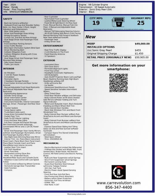 Car Revolution has a wide selection of exceptional pre-owned vehicles to choose from, including this 2024 Honda Pilot. The Pilot Touring doesn't disappoint, and comes with all the quality and understated opulence buyers have come to expect from the respected Honda marque. A truly versatile SUV, this vehicle will please even the most discerning of buyers. Sophistication & understated luxury comes standard on this Honda Pilot Touring. Well-known by many, the Pilot has become a household name in the realm of quality and prestige. When the Honda Pilot Touring was created, it was automatically enhanced by having the performance ability of all wheel drive. Not only will you notice improved steering and superior acceleration, but you can also rest easy knowing that your vehicle comes standard with increased stability and safety. There are many vehicles on the market but if you are looking for a vehicle that will perform as good as it looks then this Honda Pilot Touring is the one! Car Revolution has been in business since 1998 with 2 locations and over 300 cars. A family owned business, focused and determined to extend hospitality to all our clients. We make every effort to present information that is accurate. However, it is based on data provided by the vehicle manufacturer and other sources. Therefore exact Configuration, Color, Certification and Accessories should be used as a guide only and are not guaranteed under any circumstances, for any inaccuracies, claims of losses of any nature. All advertised prices includes all cost to be paid by the consumer, except: Title, Taxes, Registration, License Fees, Insurance, Dealer Prep, Additional Options and include all applicable rebates. Subject to Credit Approval. Every effort is made in order to display accurate and current vehicle information, including Pricing. All vehicles are subjected to prior sale, removal and transport elsewhere, awaiting Title and Ownership Confirmation. Inventory is updated daily and subject to change. Not responsible for typographical errors or omissions. To better insure the specific vehicle's availability, call us right away at 856-316-3444 and feel free to ask any questions. EMG-WB