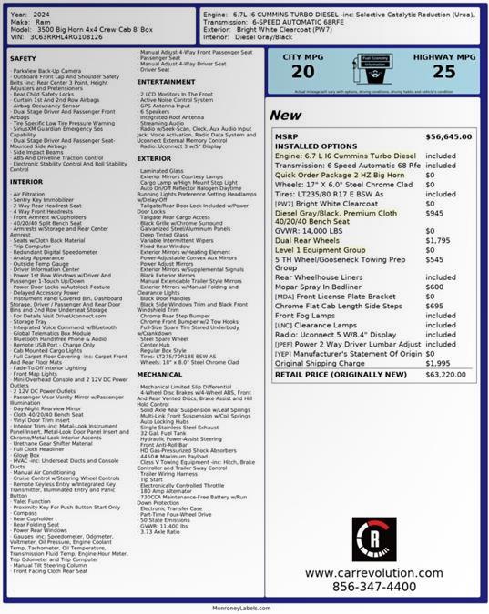 Car Revolution is pleased to be currently offering this 2024 Ram 3500 Big Horn with 63,932mi. You deserve a vehicle designed for higher expectations. This Ram 3500 Big Horn delivers with a luxurious, well-appointed interior and world-class engineering. Equipped with 4WD, this Ram 3500 Big Horn gives you added confidence to tackle the surface of any path you take. The Ram 3500 Big Horn will provide you with everything you have always wanted in a car -- Quality, Reliability, and Character. Just what you've been looking for. With quality in mind, this vehicle is the perfect addition to take home. Car Revolution has been in business since 1998 with 2 locations and over 300 cars. A family owned business, focused and determined to extend hospitality to all our clients. We make every effort to present information that is accurate. However, it is based on data provided by the vehicle manufacturer and other sources. Therefore exact Configuration, Color, Certification and Accessories should be used as a guide only and are not guaranteed under any circumstances, for any inaccuracies, claims of losses of any nature. All advertised prices includes all cost to be paid by the consumer, except: Title, Taxes, Registration, License Fees, Insurance, Dealer Prep, Additional Options and include all applicable rebates. Subject to Credit Approval. Every effort is made in order to display accurate and current vehicle information, including Pricing. All vehicles are subjected to prior sale, removal and transport elsewhere, awaiting Title and Ownership Confirmation. Inventory is updated daily and subject to change. Not responsible for typographical errors or omissions. To better insure the specific vehicle's availability, call us right away at 856-316-3444 and feel free to ask any questions. EMG-WB