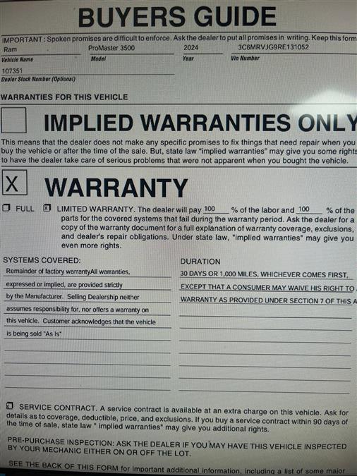 Car Revolution is honored to present a wonderful example of pure vehicle design... this 2024 Ram ProMaster 3500 Tradesman HR EXT only has 50,059mi on it and could potentially be the vehicle of your dreams! This Ram includes: Optional Equipment: Safety and Security ParkSense rear parking sensors Front fog lights Convenience Power door mirrors Heated driver and passenger side door mirrors MOPAR vinyl/rubber cargo mat Supplemental cargo area lighting Cruise control with steering wheel mounted controls Adaptive cruise control with stop and go Power folding door mirrors Rear window defroster Fixed rear windshield Day/Night rearview mirror Comfort Deep tinted windows Exterior and Appearance Non-metallic paint Full-size spare tire with steel wheel Spare tire mounted underneath the vehicle Class IV tow rating Trailer hitch Front license plate bracket Tires & Wheels Full Size Spare Tire Full-size spare tire with steel wheel Crank-down spare tire Spare tire mounted underneath the vehicle Underslung Tire Carrier Spare tire mounted underneath the vehicle Exterior Front License Plate Bracket Front license plate bracket Rear Hinged Doors with Fixed Glass Split swing-out rear cargo door Deep tinted windows Rear window defroster Fixed rear windshield Day/Night rearview mirror Deep Tint Sunscreen Glass Deep tinted windows Rear Window Defroster Rear window defroster Power Folding/heated Mirrors Power door mirrors Heated driver and passenger side door mirrors Driver and passenger convex spotter mirrors Trailer style side mirrors Power folding door mirrors Turn signal indicator in door mirrors Black door mirrors Power-Folding Mirrors Power folding door mirrors Power Adjust Mirrors Power door mirrors Power-Adjustable Convex Aux Mirrors Power driver and passenger convex spotter mirrors Front Fog Lamps Front fog lights Exterior Mirrors with Heating Element Heated driver and passenger side door mirrors Additional Options Convenience Group Power door mirrors Heated driver and passenger side door mirrors Driver and passenger convex spotter mirrors Power driver and passenger convex spotter mirrors Trailer style side mirrors Supplemental cargo area lighting Cruise control with steering wheel mounted controls Adaptive cruise control with stop and go Power folding door mirrors Turn signal indicator in door mirrors Black door mirrors Front fog lights Interior Manufacturer's Statement of Origin ParkSense Rear Park Assist System ParkSense rear parking sensors MOPAR Cargo Compartment Floor Mat MOPAR vinyl/rubber cargo mat Rear View Day/night Mirror Day/Night rearview mirror Rear Cargo LED Lamp Supplemental cargo area lighting Adaptive Cruise Control with Stop and Go Cruise control with steering wheel mounted controls Adaptive cruise control with stop and go Global Telematics Box Module Google Android Auto Apple CarPlay/Android Auto smart device mirroring Apple CarPlay Apple CarPlay/Android Auto smart device wireless mirroring Integrated Center Stack Radio Connectivity - US/Canada 4G LTE Wi-Fi Hotspot 4G LTE Wi-Fi Hot Spot mobile hotspot internet access Black Entertainment SiriusXM Radio Service 6 month satellite trial subscription AM/FM/SiriusXMsatellite Paint Bright White Clearcoat Non-metallic paint Trailering Class IV Receiver Hitch Class IV tow rating Trailer hitch *Note - For third party subscriptions or services, please contact the dealer for more information.* This Ram ProMaster 3500 Tradesman HR EXT's level of quality is not meant for just anyone. It's meant for the person who strives for a classy, comfortable, and luxurious car. There is no reason why you shouldn't buy this Ram ProMaster 3500 Tradesman HR EXT. It is incomparable for the price and quality. The quintessential Ram -- This Ram ProMaster 3500 Tradesman HR EXT speaks volumes about its owner, about uncompromising individuality, a passion for driving and standards far above the ordinary. Car Revolution has been in business since 1998 with 2 locations and over 300 cars. A family owned business, focused and determined to extend hospitality to all our clients. We make every effort to present information that is accurate. However, it is based on data provided by the vehicle manufacturer and other sources. Therefore exact Configuration, Color, Certification and Accessories should be used as a guide only and are not guaranteed under any circumstances, for any inaccuracies, claims of losses of any nature. All advertised prices includes all cost to be paid by the consumer, except: Title, Taxes, Registration, License Fees, Insurance, Dealer Prep, Additional Options and include all applicable rebates. Subject to Credit Approval. Every effort is made in order to display accurate and current vehicle information, including Pricing. All vehicles are subjected to prior sale, removal and transport elsewhere, awaiting Title and Ownership Confirmation. Inventory is updated daily and subject to change. Not responsible for typographical errors or omissions. To better insure the specific vehicle's availability, call us right away at 856-316-3444 and feel free to ask any questions. EMG-WB Car Revolution is honored to present a wonderful example of pure vehicle design... this 2024 Ram ProMaster Cargo Van Tradesman only has 50,059mi on it and could potentially be the vehicle of your dreams! Indulge yourself with one of the most highly crafted, most luxurious automobiles available today. Just what you've been looking for. With quality in mind, this vehicle is the perfect addition to take home. This is about the time when you're saying it is too good to be true, and let us be the one's to tell you, it is absolutely true. There is no reason why you shouldn't buy this Ram ProMaster Cargo Van Tradesman. It is incomparable for the price and quality. Car Revolution has been in business since 1998 with 2 locations and over 300 cars. A family owned business, focused and determined to extend hospitality to all our clients. We make every effort to present information that is accurate. Ho