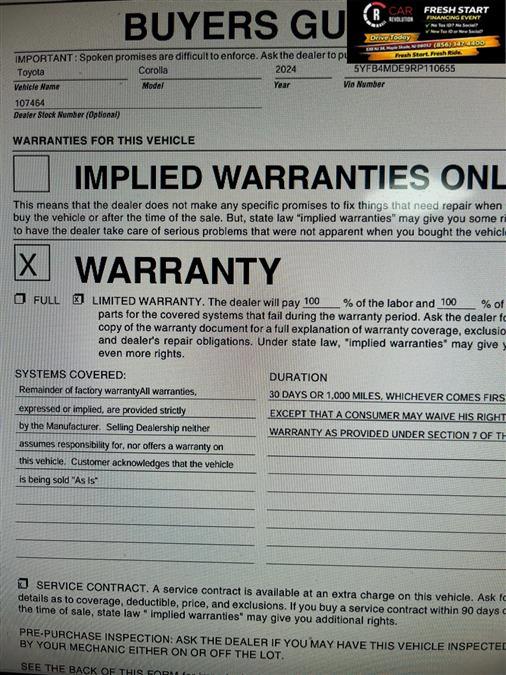 This 2024 Toyota Corolla LE CVT is offered to you for sale by Car Revolution. This Toyota includes: Optional Equipment: Interior Black Exterior and Appearance Metallic paint Paint Classic Silver Metallic Metallic paint Emissions 50 State Emissions LEV3-SULEV30 emissions Tier 3 Bin 30 emissions *Note - For third party subscriptions or services, please contact the dealer for more information.* Stylish and fuel efficient. It's the perfect vehicle for keeping your fuel costs down and your driving enjoying up. The Toyota Corolla LE CVT will provide you with everything you have always wanted in a car -- Quality, Reliability, and Character. This is about the time when you're saying it is too good to be true, and let us be the one's to tell you, it is absolutely true. Car Revolution has been in business since 1998 with 2 locations and over 300 cars. A family owned business, focused and determined to extend hospitality to all our clients. We make every effort to present information that is accurate. However, it is based on data provided by the vehicle manufacturer and other sources. Therefore exact Configuration, Color, Certification and Accessories should be used as a guide only and are not guaranteed under any circumstances, for any inaccuracies, claims of losses of any nature. All advertised prices includes all cost to be paid by the consumer, except: Title, Taxes, Registration, License Fees, Insurance, Dealer Prep, Additional Options and include all applicable rebates. Subject to Credit Approval. Every effort is made in order to display accurate and current vehicle information, including Pricing. All vehicles are subjected to prior sale, removal and transport elsewhere, awaiting Title and Ownership Confirmation. Inventory is updated daily and subject to change. Not responsible for typographical errors or omissions. To better insure the specific vehicle's availability, call us right away at 856-316-3444 and feel free to ask any questions. EMG-WB Car Revolution has a wide selection of exceptional pre-owned vehicles to choose from, including this 2024 Toyota Corolla. If you are looking for a vehicle with great styling, options and incredible fuel economy, look no further than this quality automobile. The Toyota Corolla LE will provide you with everything you have always wanted in a car -- Quality, Reliability, and Character. You've found the one you've been looking for. Your dream car. The quintessential Toyota -- This Toyota Corolla LE speaks volumes about its owner, about uncompromising individuality, a passion for driving and standards far above the ordinary. Car Revolution has been in business since 1998 with 2 locations and over 300 cars. A family owned business, focused and determined to extend hospitality to all our clients. We make every effort to present information that is accurate. However, it is based on data provided by the vehicle manufacturer and other sources. Therefore exact Configuration, Color, Certification and Accessories should be used as a guide only and are not guaranteed under any circumstances, for any inaccuracies, claims of losses of any nature. All advertised prices includes all cost to be paid by the consumer, except: Title, Taxes, Registration, License Fees, Insurance, Dealer Prep, Additional Options and include all applicable rebates. Subject to Credit Approval. Every effort is made in order to display accurate and current vehicle information, including Pricing. All vehicles are subjected to prior sale, removal and transport elsewhere, awaiting Title and Ownership Confirmation. Inventory is updated daily and subject to change. Not responsible for typographical errors or omissions. To better insure the specific vehicle's availability, call us right away at 856-316-3444 and feel free to ask any questions. EMG-WB
