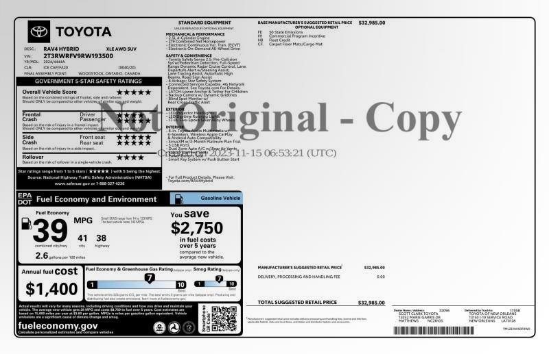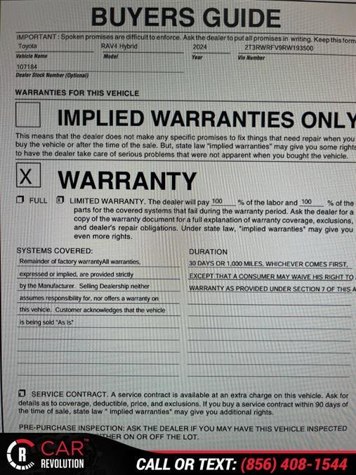 2024ToyotaRAV4 Hybrid This Toyota includes: Optional Equipment: Interior Carpet Mat Package includes: Carpet Floor Mats Carpet Cargo Mat Carpet front and rear floor mats Carpet cargo mat Black Convenience Carpet cargo mat Comfort Carpet front and rear floor mats Exterior and Appearance Non-metallic paint Paint Ice Cap Non-metallic paint Emissions 50 State Emissions LEV3-SULEV30 emissions Tier 3 Bin 30 emissions *Note - For third party subscriptions or services, please contact the dealer for more information.* The Toyota RAV4 Hybrid is the benchmark all other SUVs strive to meet. With exceptional power, towing and handling, this SUV can handle anything thrown at it. Stylish and fuel efficient. It's the perfect vehicle for keeping your fuel costs down and your driving enjoying up. Enjoy driving? Well now you will get more thrills behind the wheel thanks to the heightened performance of AWD. Better handling. Better traction. Better driving experience. Car Revolution has been in business since 1998 with 2 locations and over 300 cars. A family owned business, focused and determined to extend hospitality to all our clients. We make every effort to present information that is accurate. However, it is based on data provided by the vehicle manufacturer and other sources. Therefore exact Configuration, Color, Certification and Accessories should be used as a guide only and are not guaranteed under any circumstances, for any inaccuracies, claims of losses of any nature. All advertised prices includes all cost to be paid by the consumer, except: Title, Taxes, Registration, License Fees, Insurance, Dealer Prep, Additional Options and include all applicable rebates. Subject to Credit Approval. Every effort is made in order to display accurate and current vehicle information, including Pricing. All vehicles are subjected to prior sale, removal and transport elsewhere, awaiting Title and Ownership Confirmation. Inventory is updated daily and subject to change. Not responsible for typographical errors or omissions. To better insure the specific vehicle's availability, call us right away at 856-316-3444 and feel free to ask any questions. EMG-WB Thank you for visiting another one of Car Revolution's online listings! Please continue for more information on this 2024 Toyota RAV4 Hybrid XLE with 110,478mi. If you're in the market for an incredible SUV -- and value on-the-road comfort and manners more than ultimate off-road prowess or tow capacity -- you'll definitely want to check out this Toyota RAV4 Hybrid XLE. Save money at the pump with this fuel-sipping Toyota RAV4. Few vehicles can match the safety and comfort of this AWD Toyota RAV4 Hybrid XLE. With enhanced performance, refined interior and exceptional fuel efficiency, this AWD Toyota is in a class of its own. This is the one. Just what you've been looking for. Car Revolution has been in business since 1998 with 2 locations and over 300 cars. A family owned business, focused and determined to extend hospitality to all our clients. We make every effort to present information that is accurate. However, it is based on data provided by the vehicle manufacturer and other sources. Therefore exact Configuration, Color, Certification and Accessories should be used as a guide only and are not guaranteed under any circumstances, for any inaccuracies, claims of losses of any nature. All advertised prices includes all cost to be paid by the consumer, except: Title, Taxes, Registration, License Fees, Insurance, Dealer Prep, Additional Options and include all applicable rebates. Subject to Credit Approval. Every effort is made in order to display accurate and current vehicle information, including Pricing. All vehicles are subjected to prior sale, removal and transport elsewhere, awaiting Title and Ownership Confirmation. Inventory is updated daily and subject to change. Not responsible for typographical errors or omissions. To better insure the specific vehicle's availability, call us right away at 856-316-3444 and feel free to ask any questions. EMG-WB