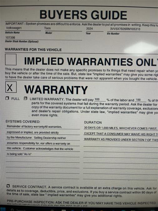 Used 2024 Volkswagen Taos S FWD|88,211 Miles|Front Wheel Drive