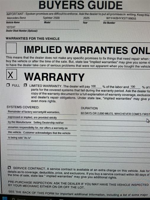 Pictures of used 2025 Mercedes-benz Sprinter 2500 Standard Roof 4-Cyl Diesel 144 in Maple Shade, NJ
